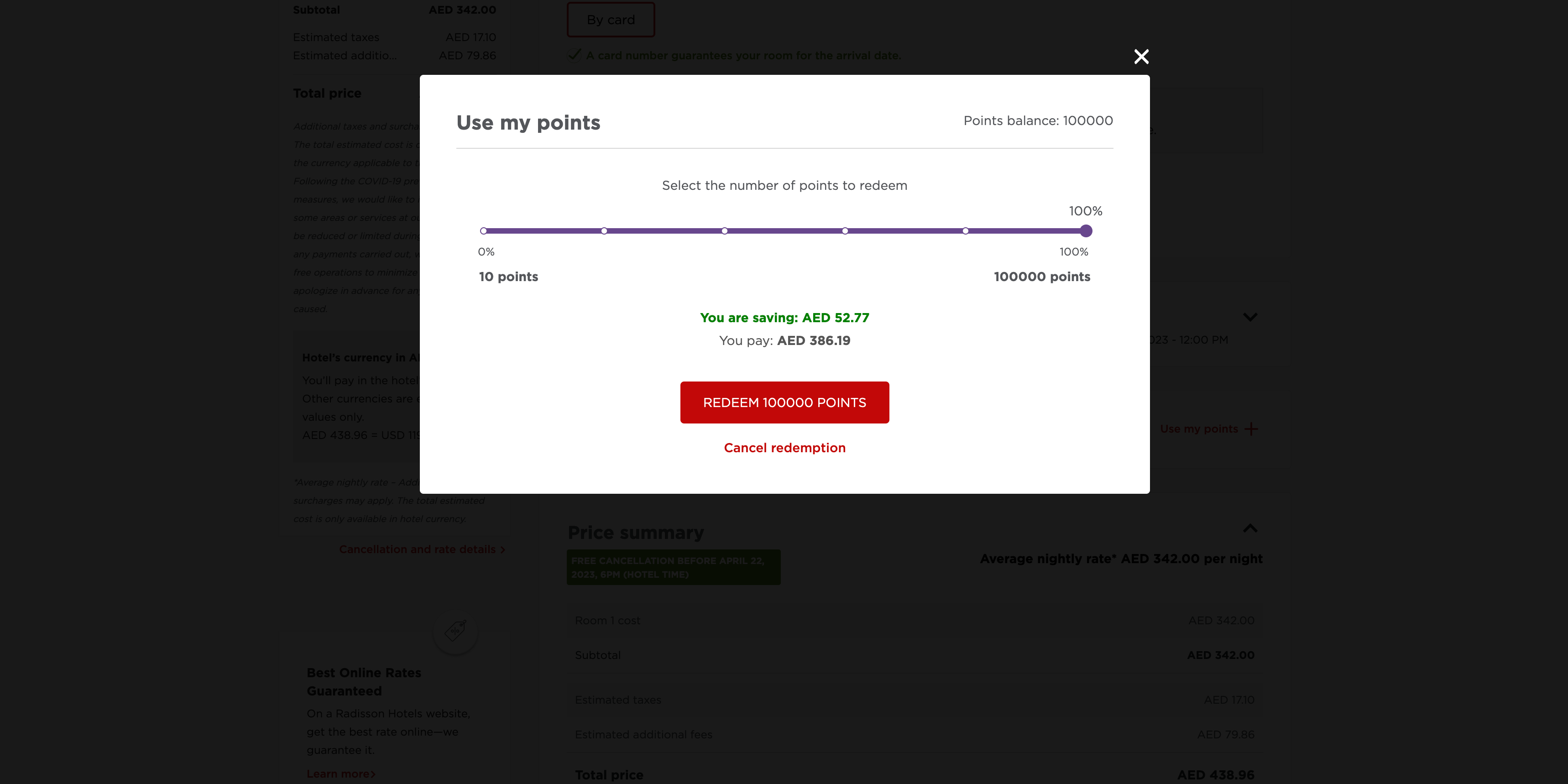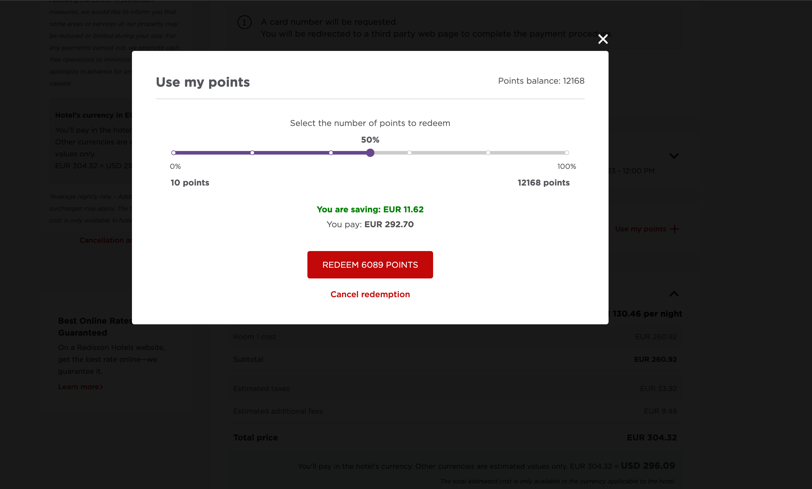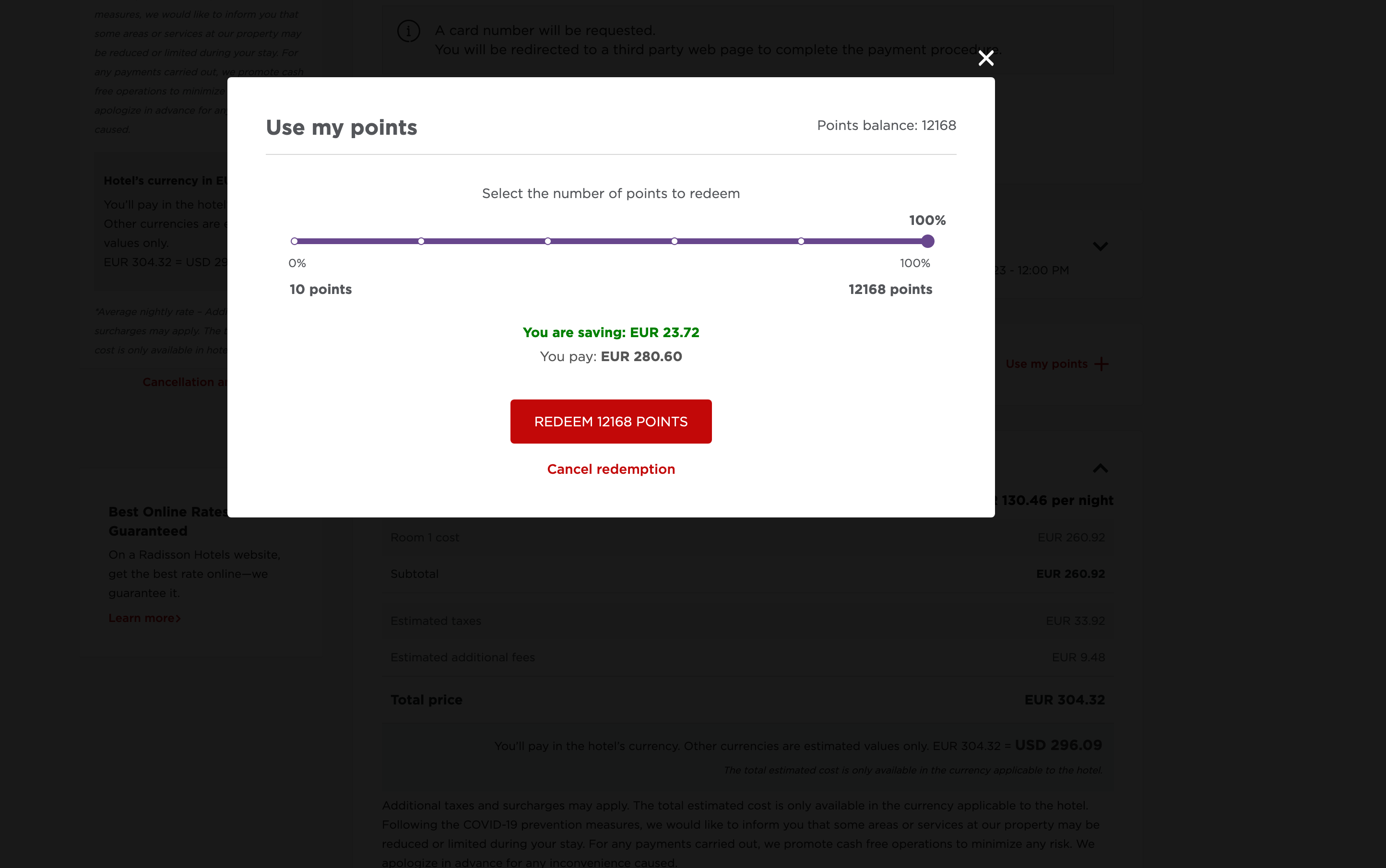 If I move the points slider to use my entire Radisson Rewards balance (12,168 points), the cash price drops to $276.08. This gives the points a value of 0.23 cents per point — marginally better, but still a poor value overall.