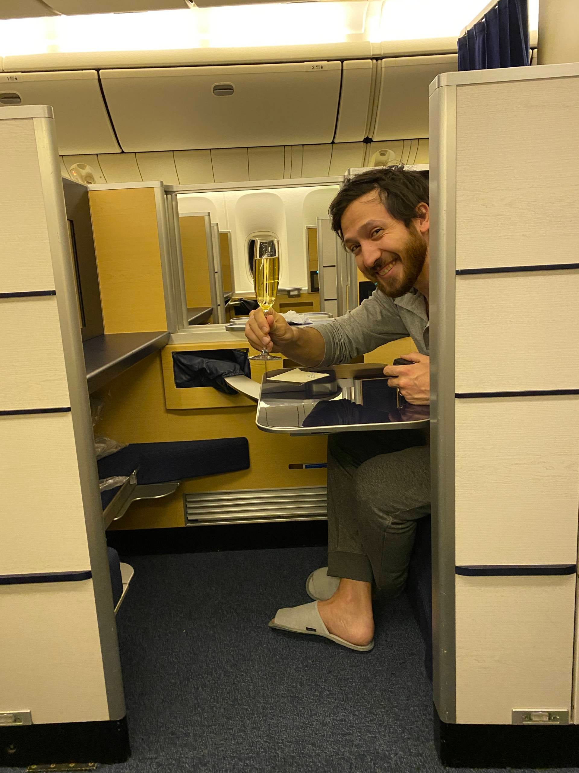 Once on board, they discovered there was only one other person in the first-class cabin, so they essentially got four seats to themselves to use however they wanted. William recalls, "The flight attendants recommended that we use one seat to eat our meals and the other to sleep, so we took their recommendation. While we enjoyed our meals, they were busy preparing the other seat and making our beds for us to sleep in. So spectacular."