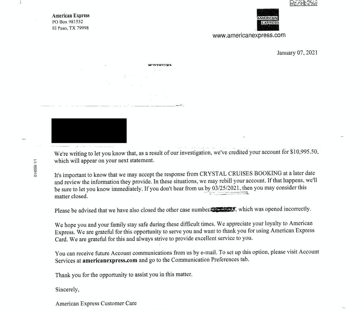 After radio silence from Crystal Cruises, Heath went about contacting American Express to file a dispute on the charges to her Amex Platinum.