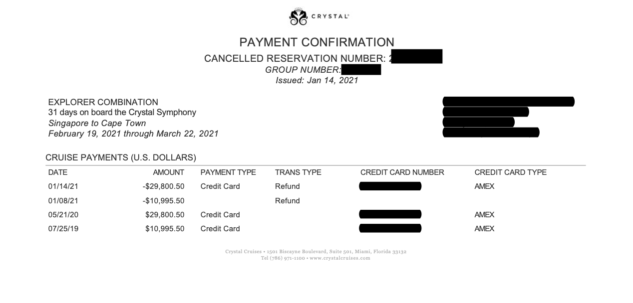 "It is a real shame that Crystal Cruises has ruined its excellent reputation by their very poor handling of cruise cancellations and requested refunds. We had a significant amount of money tied up on this once-in-a-lifetime month-long cruise so receiving these credits was a huge relief for us."