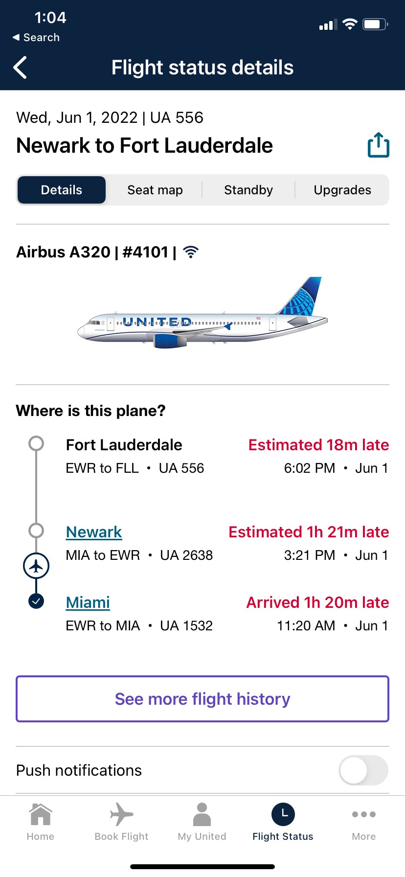 If you're at the airport and worried about delays, you can also choose the pull-down menu in the United app for "Flight Status Details" and click "See More Flight History." You can follow and track your flight's history, answering the age-old question "Where is my plane?" Beyond letting you know that your flight is delayed, it shows you if the plane has left its origin airport yet and whether it's en route or not. If the answer is, unfortunately "No," you can put yourself on standby for the next available flight before most other travelers realize there's even an issue.