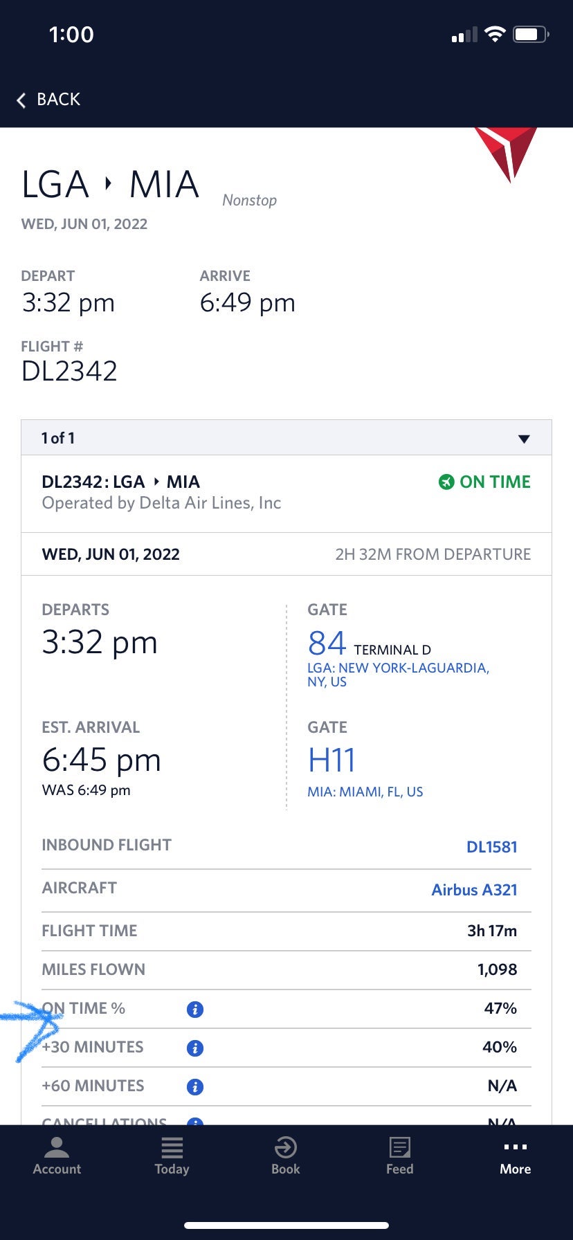 The Delta app also allows you to see the "On-Time Performance" average for a flight. Perhaps not surprisingly, based on the issues Delta experienced with staffing this season, many flights on the New York to Miami routing we checked hovered around the 50% mark, with this mid-afternoon option particularly troublesome. Consulting this rating as you pick a flight to book may help you avoid some of the worst delays on your route.