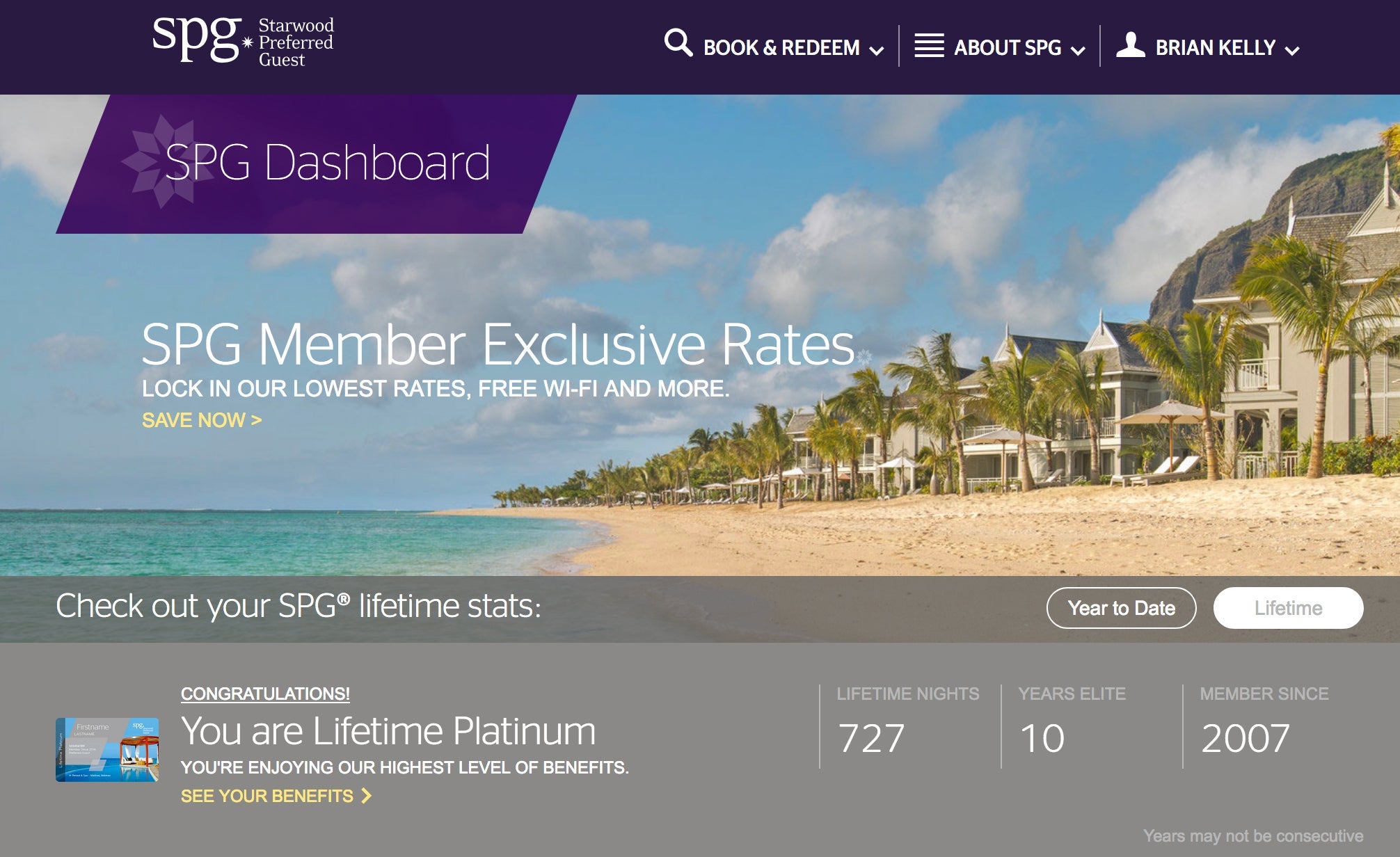 In my case, I earned well over 500 nights in the last 10 years — in fact, my SPG Dashboard shows I'm over 700. I do stay at a lot of SPG properties, but one of the ways I've been able to increase my nights over the years is by booking rooms for friends who are traveling with me, since you can get credit for up to three rooms on one SPG reservation.