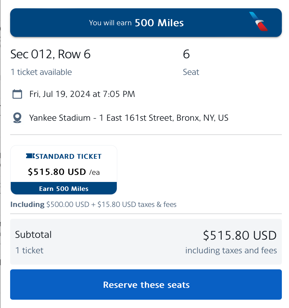 After searching for tickets, you need to find your desired event and then proceed to the checkout page. (This portal is operated in partnership with Ticketmaster, so you should be able to see most standard and resale ticket options that Ticketmaster offers.) The search results will display how many miles you'd earn if you paid in cash, but you'll want to ignore that figure if you're planning to redeem miles.