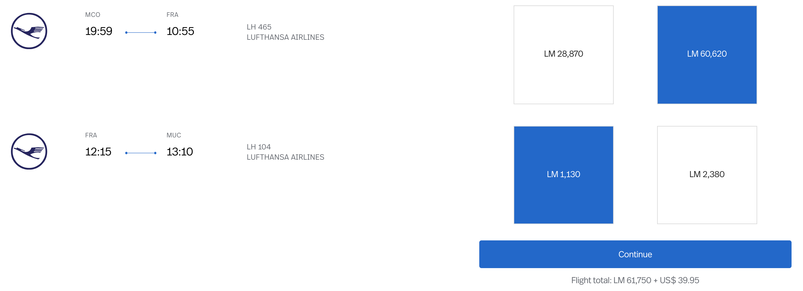 Like United, Avianca doesn't impose fuel surcharges on Lufthansa-operated award tickets — or any partner airline, for that matter. Nonstop, one-way award tickets in business class from the US to Europe will only set you back 63,000 miles. However, if you book a mixed-cabin award with a connection in economy, your actual mileage rate will be even lower, like this ticket from Orlando (MCO) to Munich (MUC) via Frankfurt (FRA):