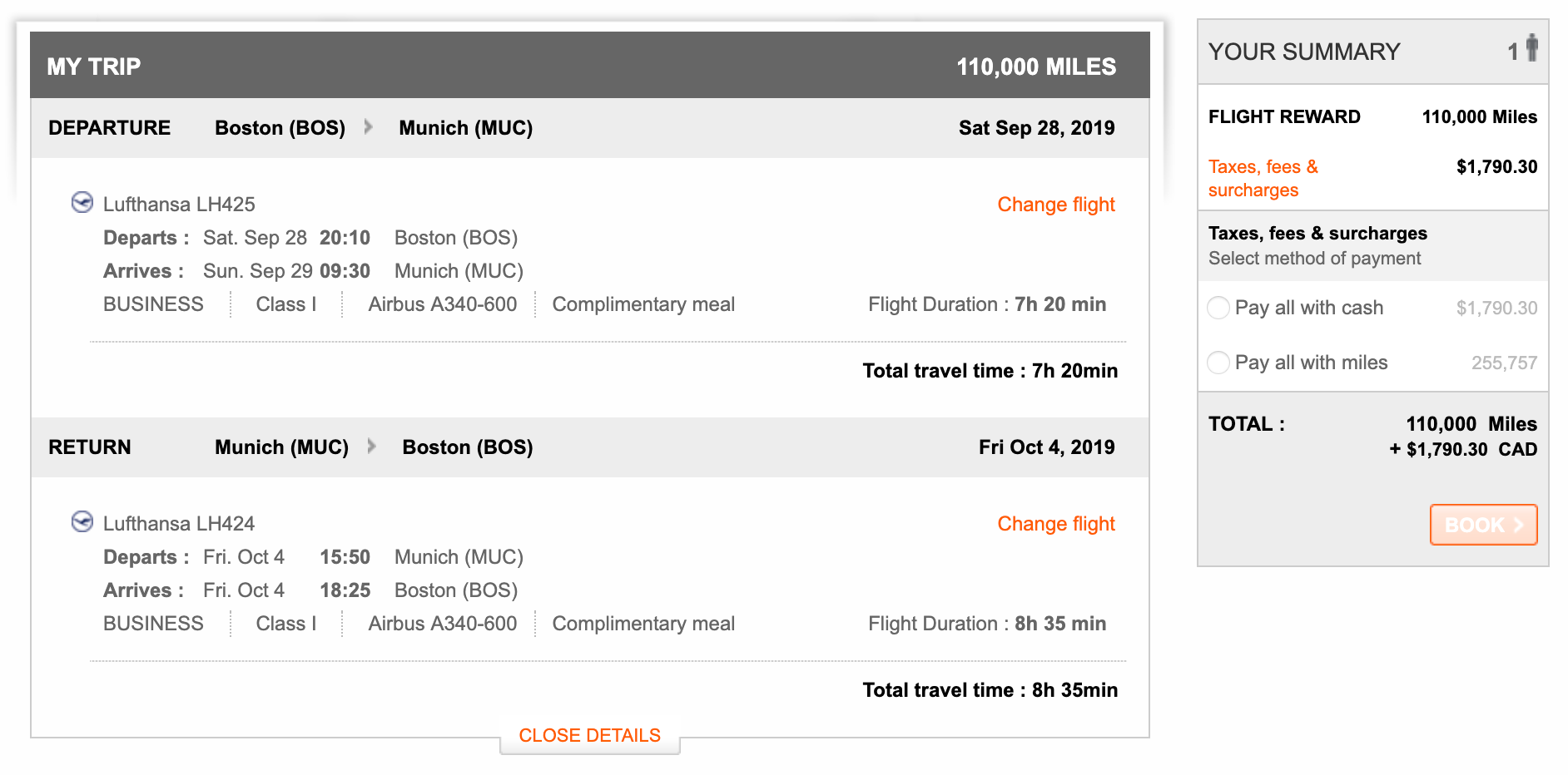 Another booking option for these awards is Air Canada's Aeroplan program — one that partners with both Amex Membership Rewards (1:1) and Capital One (2:1.5). The mileage rates are noticeably lower, as you'll need just 55,000 miles for a one-way, business-class award from the US to Europe. However, you will be subject to massive fuel surcharges — $1,790.30 CAD (~$1,353 USD based on current exchange rates) for this round-trip ticket from Boston: