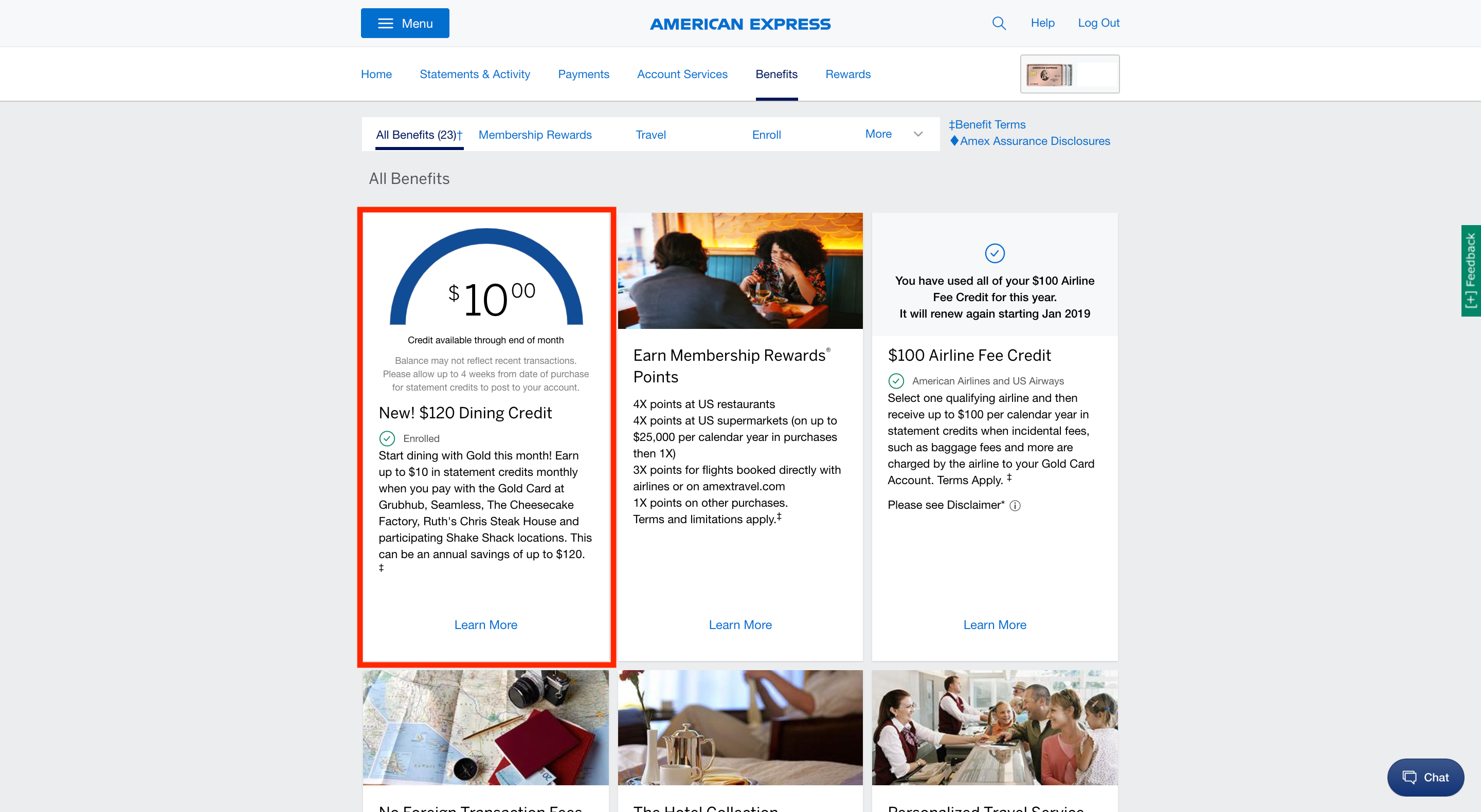 Once you've logged in to your Amex account, select your Gold card in the top right-hand corner. Then, select "Benefits" on the top bar.