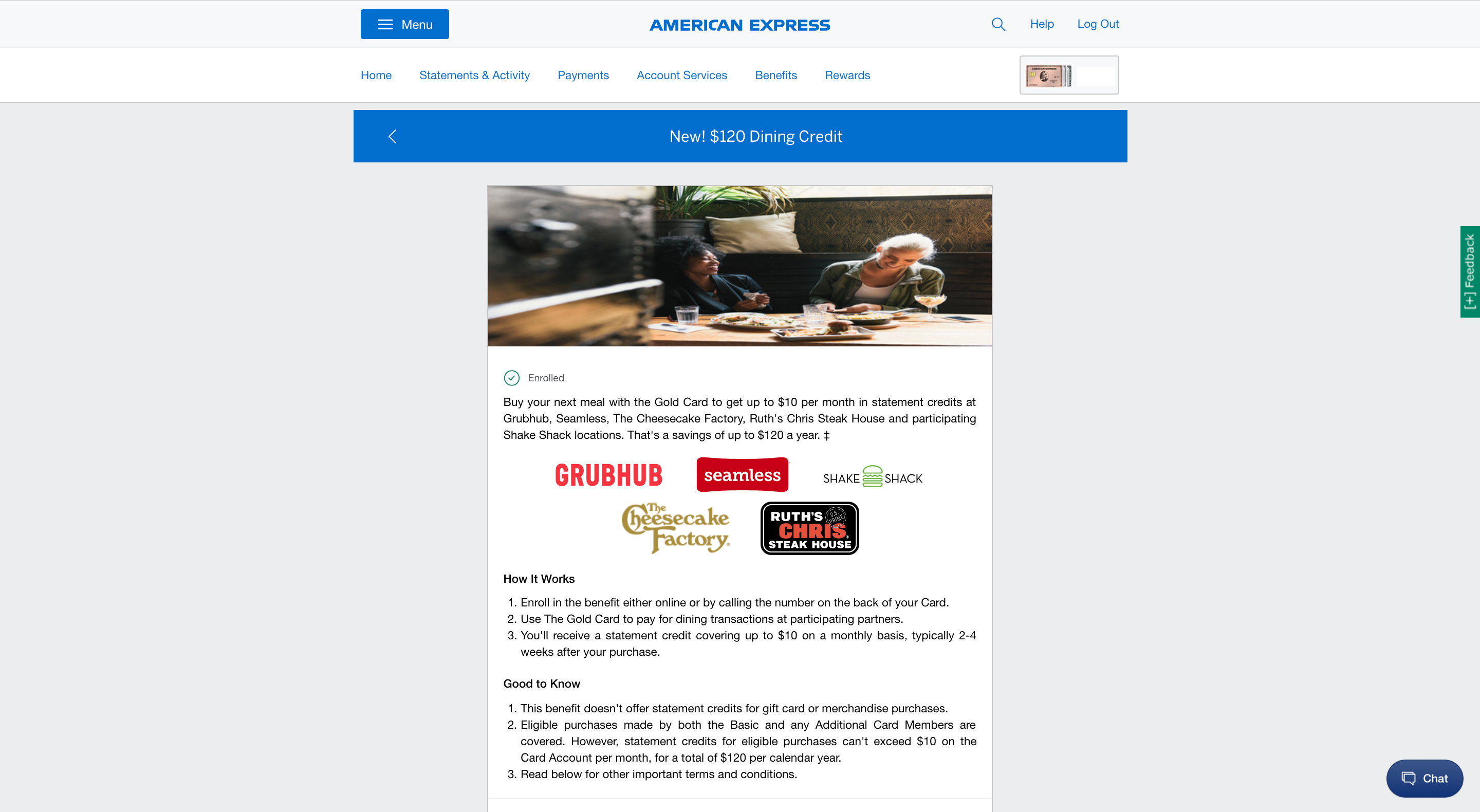 From there, you'll see the up to $120 dining credit benefit on the first column to the left. If not, just scroll down until you do. The credit is distributed as up to $10 statement credits per month, so you'll want to make sure you're ordering from a participating merchant at least once a month to take full advantage. Enrollment is required.