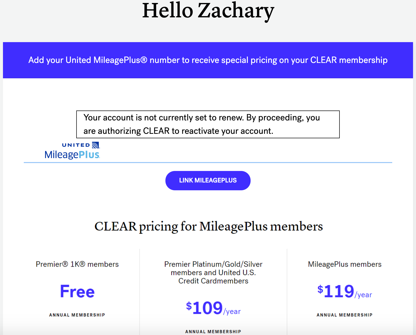 As an existing CLEAR member with a suspended paid membership, I had a few options to renew for free: