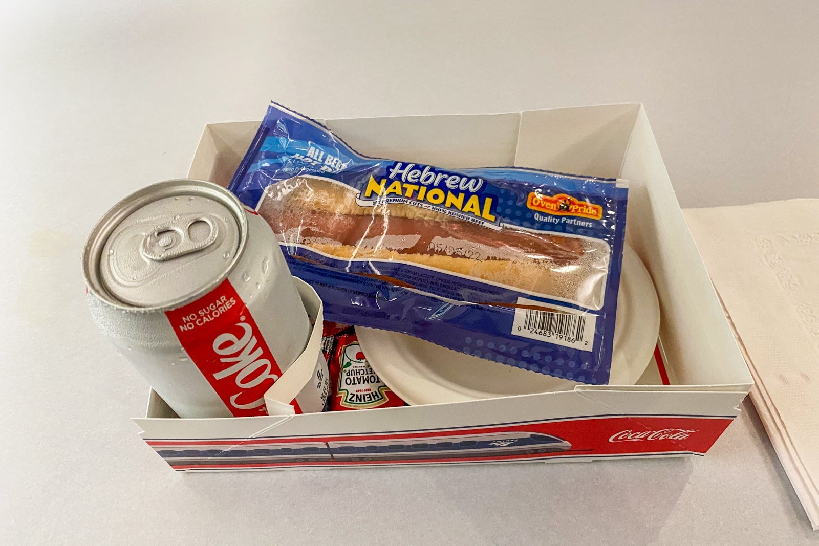 Because my first choice of boneless chicken wings was unavailable, I had a hot dog and a soda for lunch. The hot dog was $5.25, and the soda was $2.50.