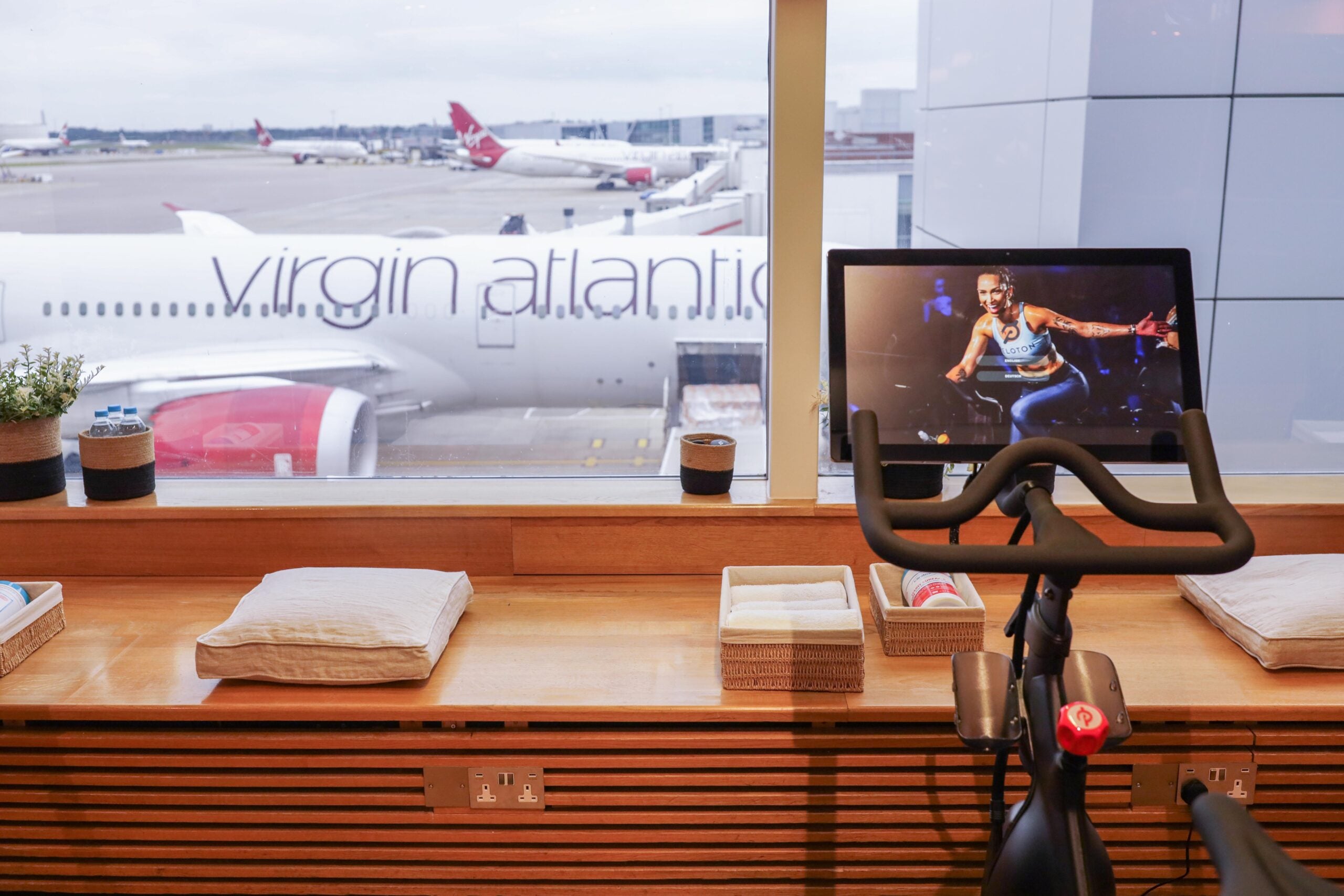 The real showstopper though is the addition of three Peloton bikes, all positioned with a perfect view over the tarmac. Clubhouse guests can now get their sweat on, watching Virgin Atlantic planes arrive and depart at the Terminal 3 gates, as well as watch over the runway and the Heathrow control tower.
