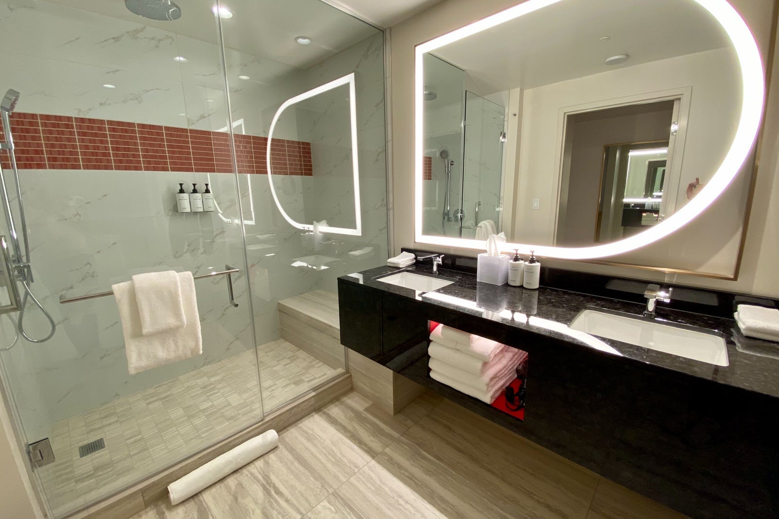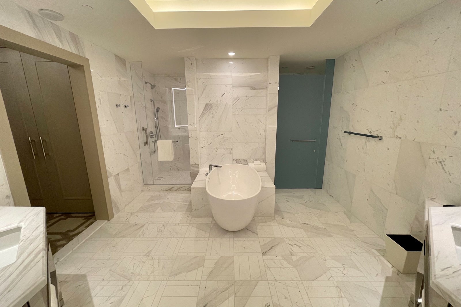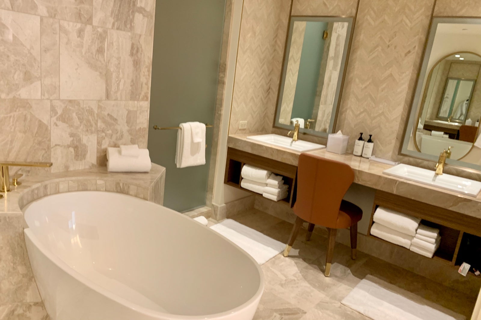 The bathroom had a rainfall shower, private toilet, giant soaking tub and double vanity. With more than 40 food outlets in the complex, it was refreshing to see that the bathroom did not include a scale.