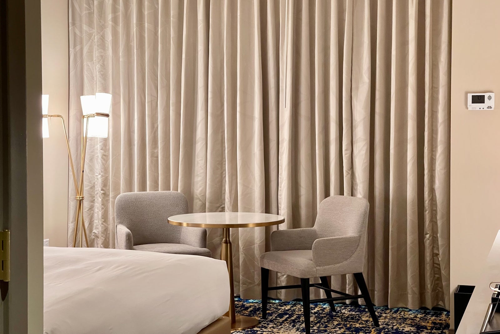 Functionally, the blackout curtains did their job, the thermostat did a great job cranking the temperatures down when asked and the shower was great in terms of temperature and water pressure.