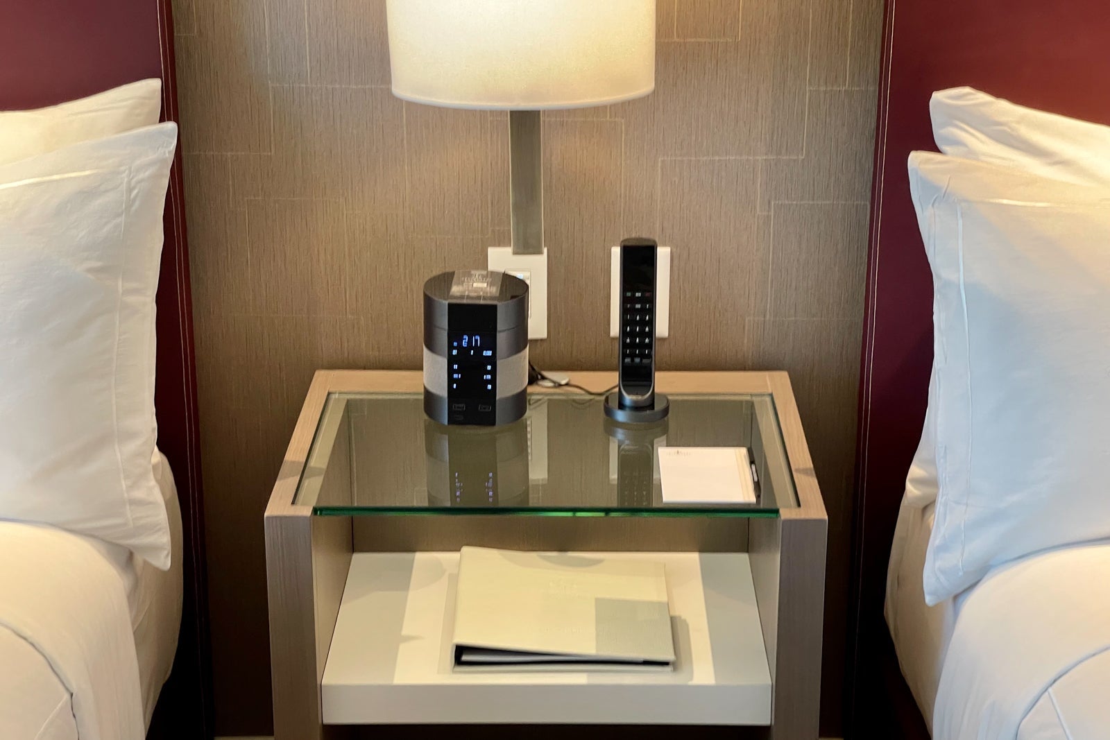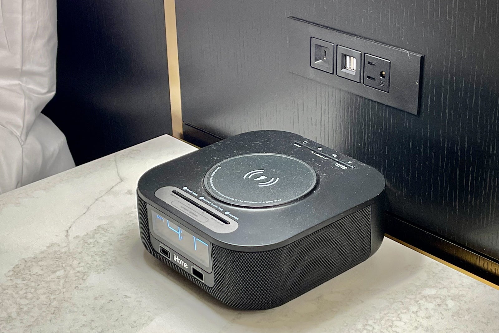 Tech-savvy travelers will appreciate that each side table had two USB-A ports, one USB-C port and a power outlet. Each room has an alarm clock with a built-in speaker and a Qi-wireless charger that works with the latest devices, including the entire iPhone 12 lineup.