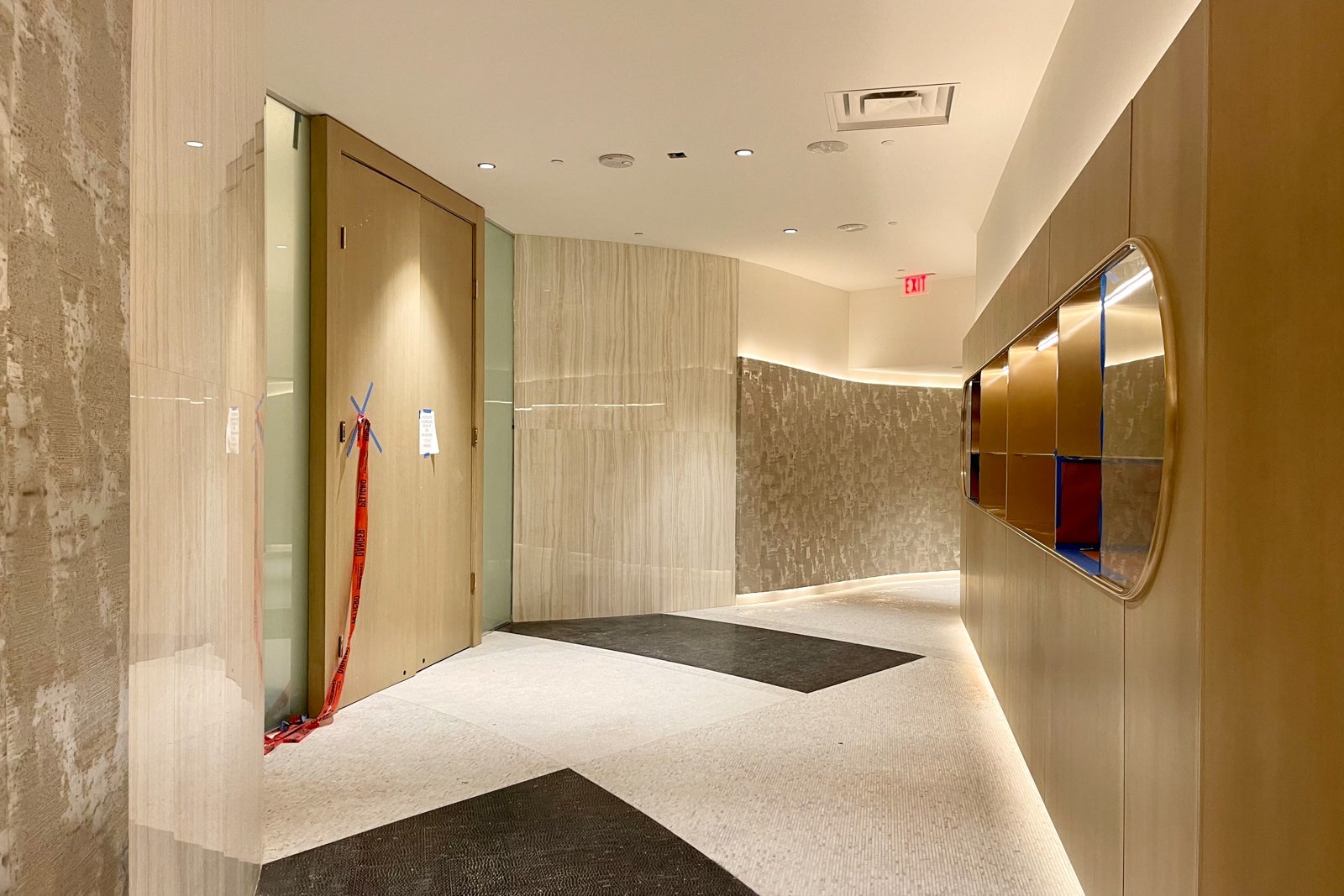 There is a separate check-in area. There are two private elevator banks - one for floors 61-63 and the other for 64 through the top 66th floor. (Note: the hotel skips floors 4 and 40-49 because, as mentioned previously, in some cultures, the number four is considered unlucky since it sounds similar to the word "death." There's also no 13th floor for us superstitious Americans.)