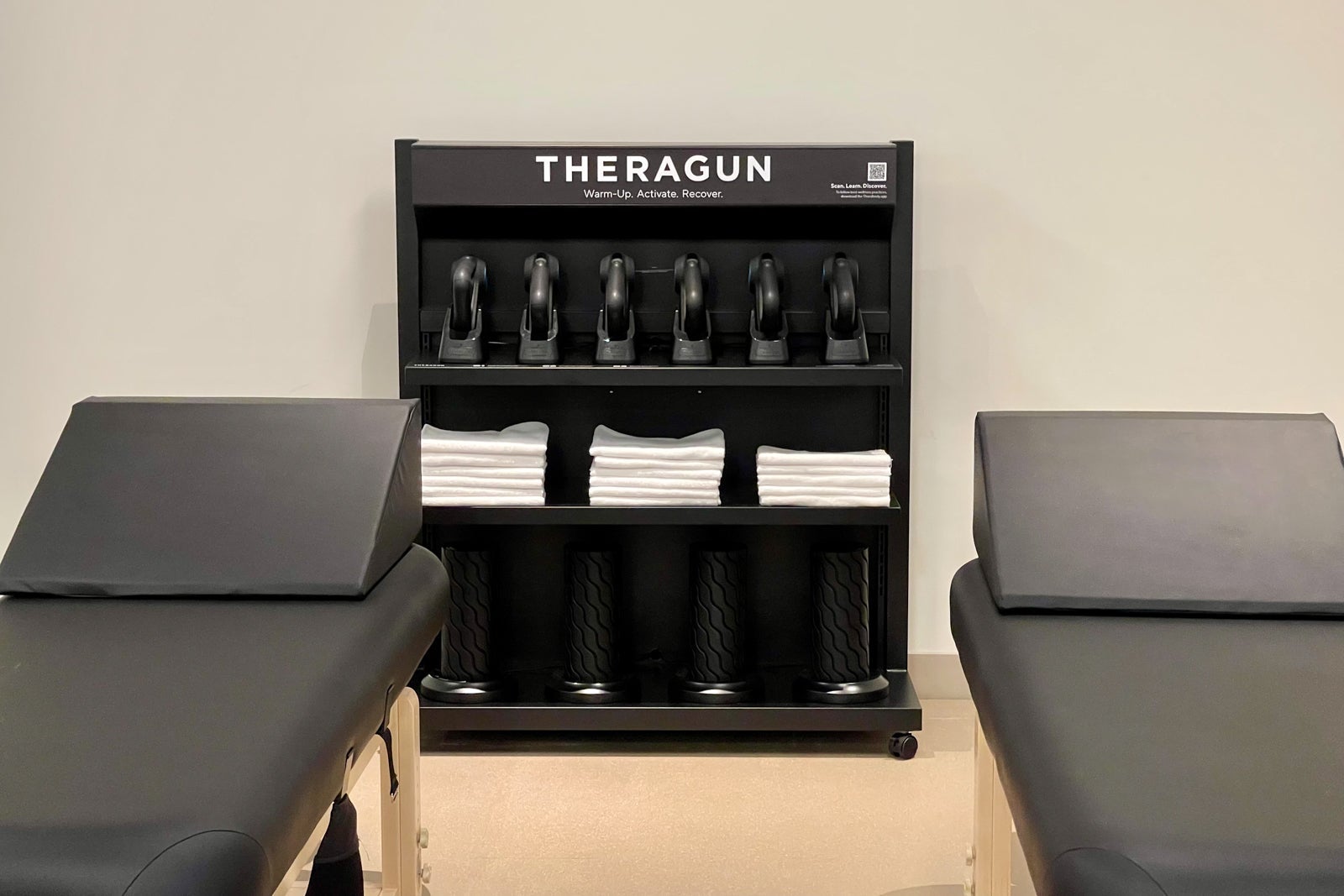 The gym will soon offer stretching sessions for a yet undisclosed fee. Until then, guests can use one of the Theragun massage guns for free.