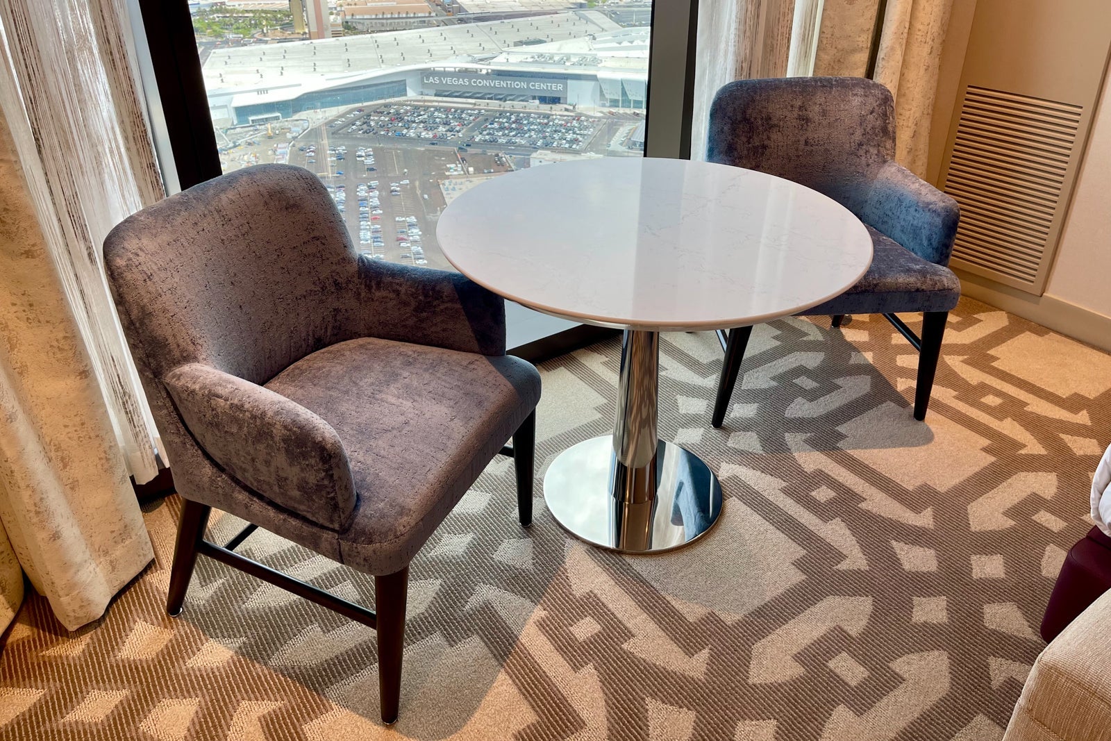 There's no desk in the room — just two chairs around a small circular table. This wasn't ideal for our work trip, but vacationers likely won't mind.