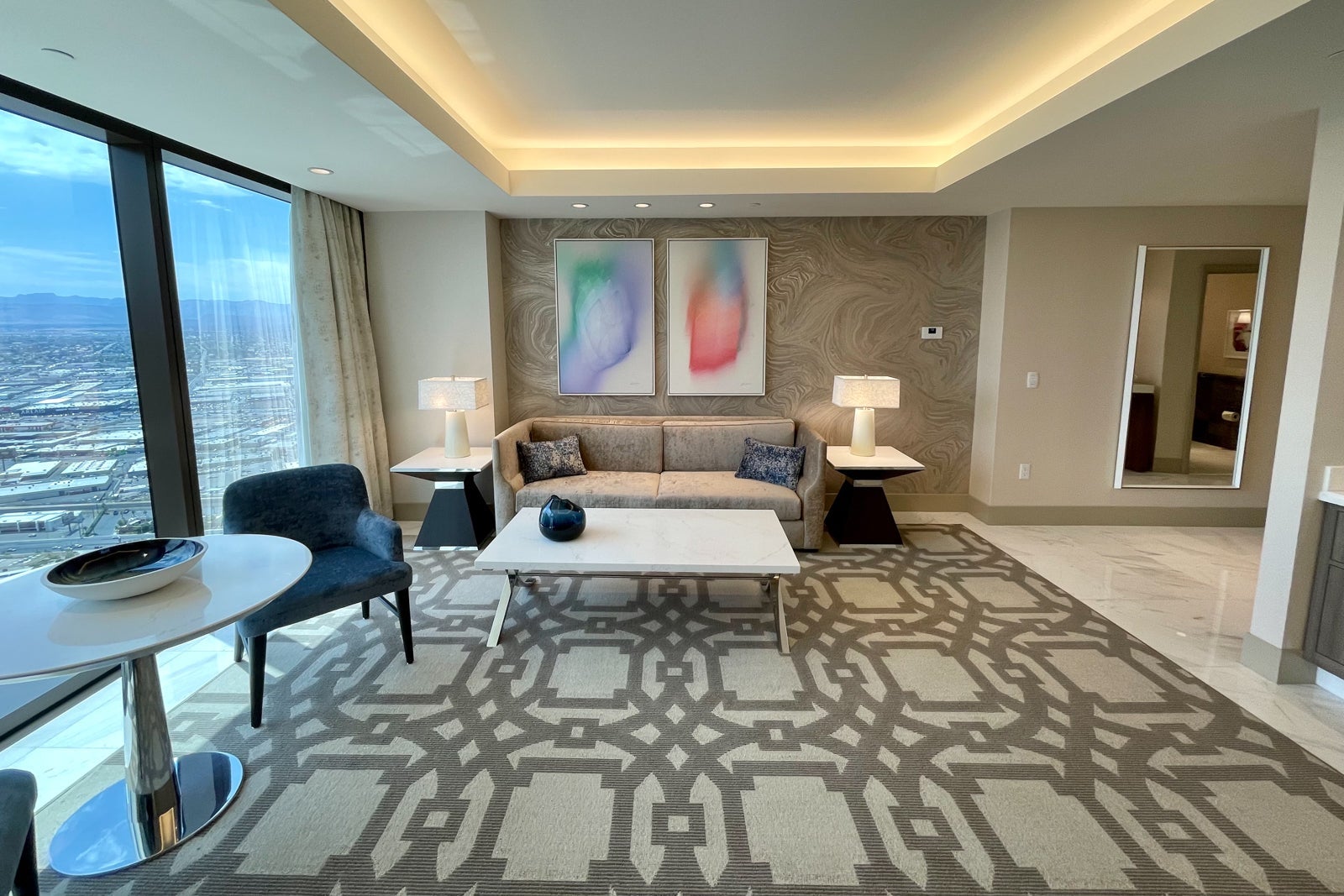 Unlike the rooms below, this suite has floor-to-ceiling windows giving great views of the Wynn, Encore of the rest of The Strip beyond.