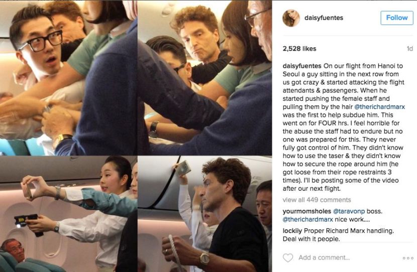 According to Fuentes, the man "got crazy & started attacking the flight attendants & passengers. When he started pushing the female staff and pulling them by the hair @therichardmarx was the first to help subdue him."