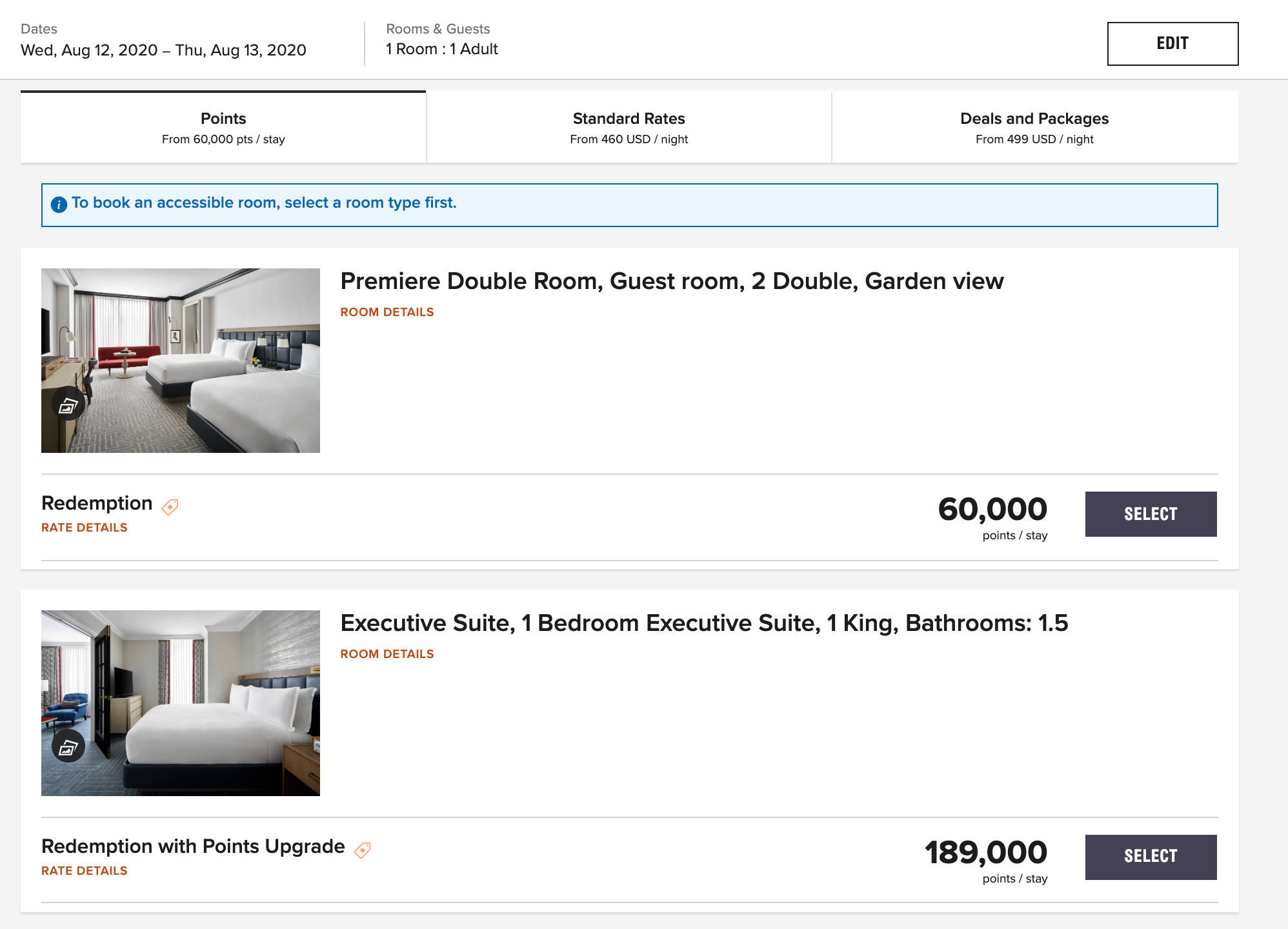 Unfortunately, the only way to end up in a club level room is to book one outright or to pay cash to upgrade. If we take a look at the Ritz-Carlton Washington D.C., we can see that this coming summer, a standard double bed guest room costs 60,000 points per day (which means that this Category 7 hotel is operating under standard award pricing during these dates). You also have the option to book a one-bedroom executive suite for 189,000 points per night, worth $1,512 based on TPG's valuations (a bad deal, since the cash rate is only ~$650).