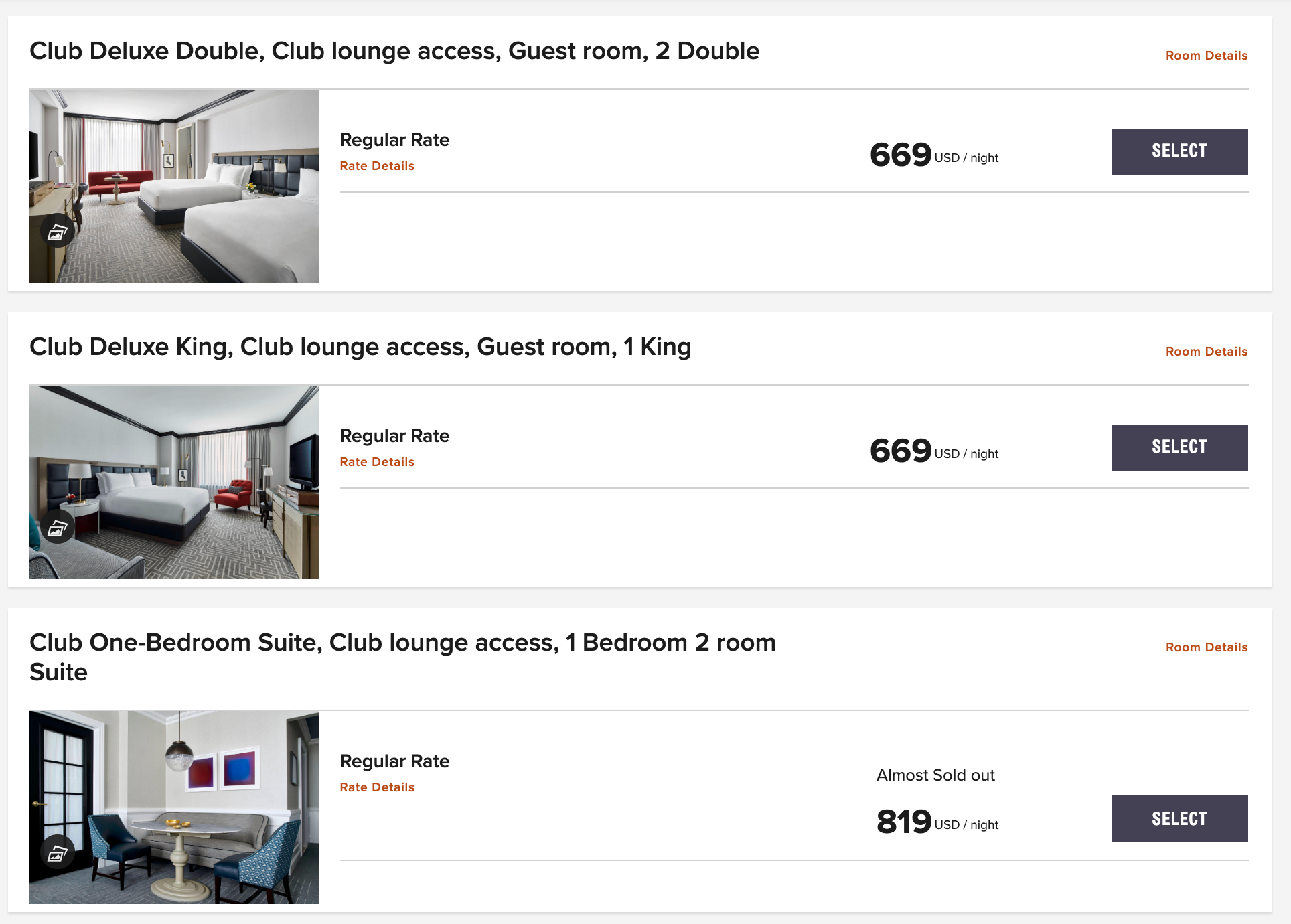 Note that each of these rooms cost at least $200 per night more than a base/standard room, which means you'd have to eat and drink a lot in the lounge to make up for that extra cost. If you book a base room and decide to upgrade to a club level, the exact cost will vary from hotel to hotel so you'll have to reach out to the specific property to inquire about the rate.