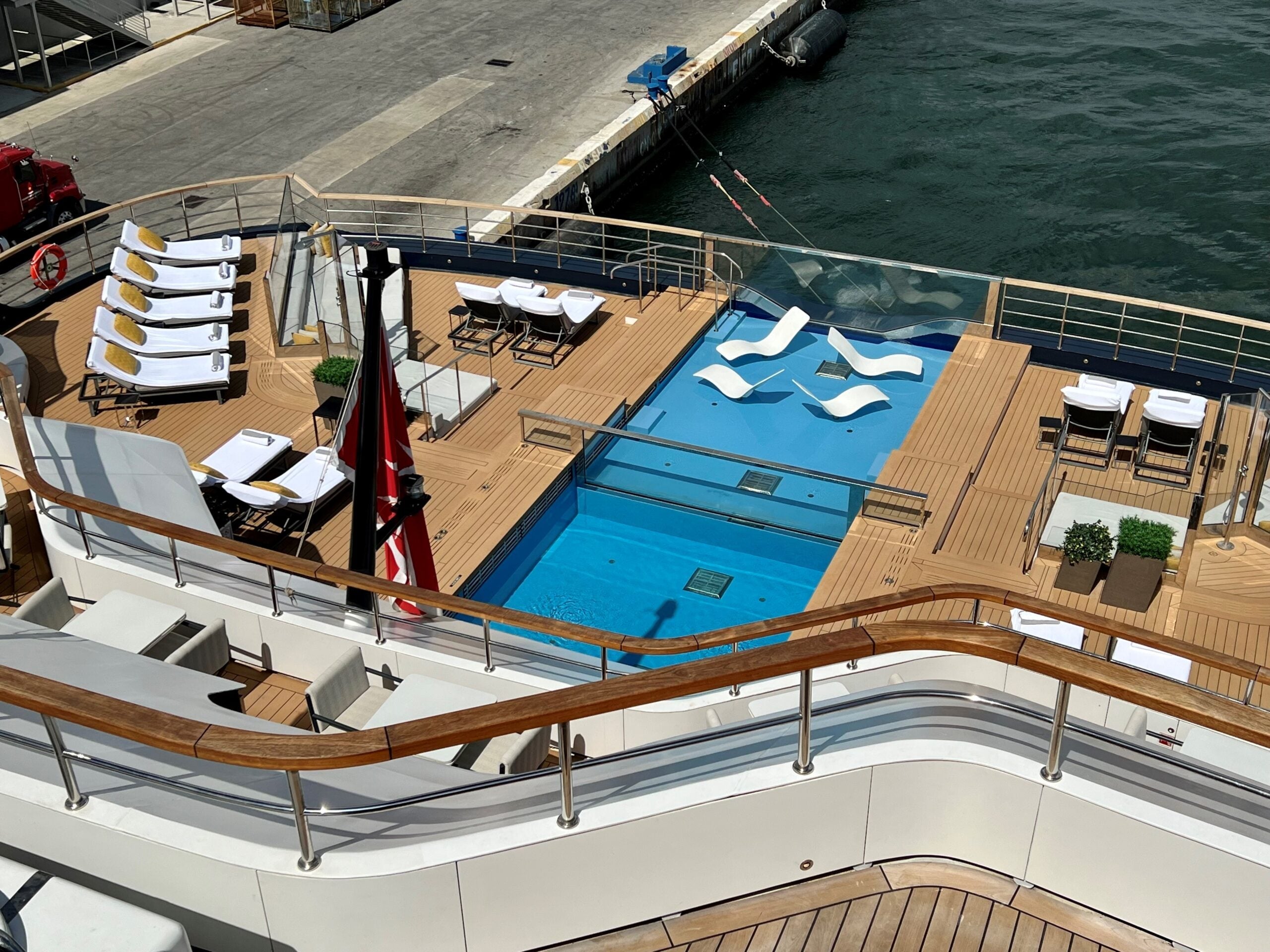It was one of two major public areas that left me scratching my head. The other was the main pool area at the back of the vessel. It had a lovely (if narrow) infinity pool as a focal point and was an enticing space. The only problem: It wasn't big enough — at least for a vessel that is designed to hold 298 passengers. I counted just 18 lounge chairs around the pool, plus two sofalike day bed clusters that probably could accommodate another 10 to 15 people. There also were four additional chairs positioned within a shallow portion of the pool itself.