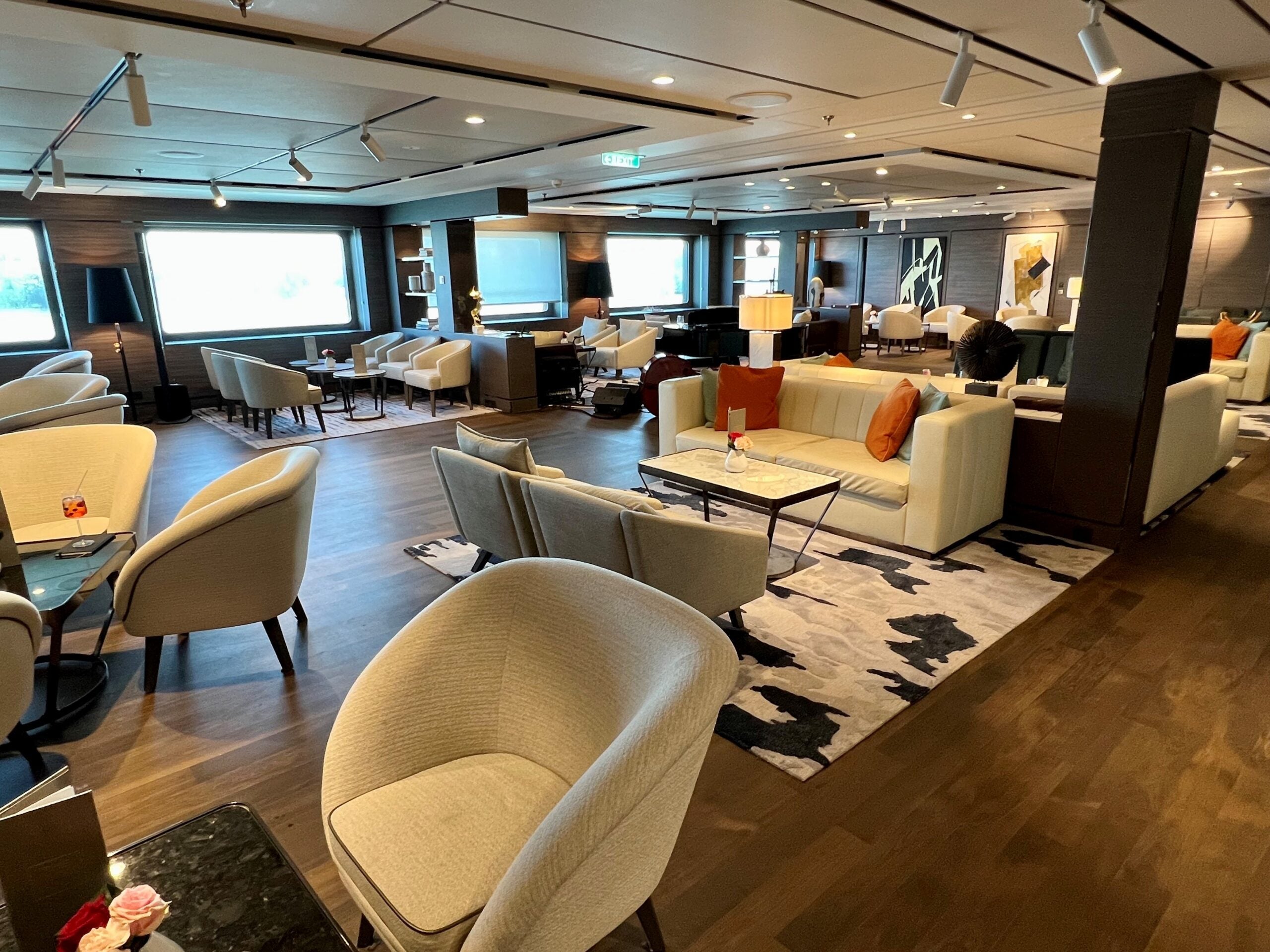 Meanwhile, just off the entrance, what should have been Evrima's marquee interior space, its main lounge (known as The Living Room), was oddly disjointed. Designed as the ship's central gathering place, it had no central focal point, such as the soaring, back-lit whiskey bar that commands the center of the main lounge on what is perhaps the closest luxury vessel to Evrima at sea: Scenic Luxury Cruises' 3-year-old Scenic Eclipse.