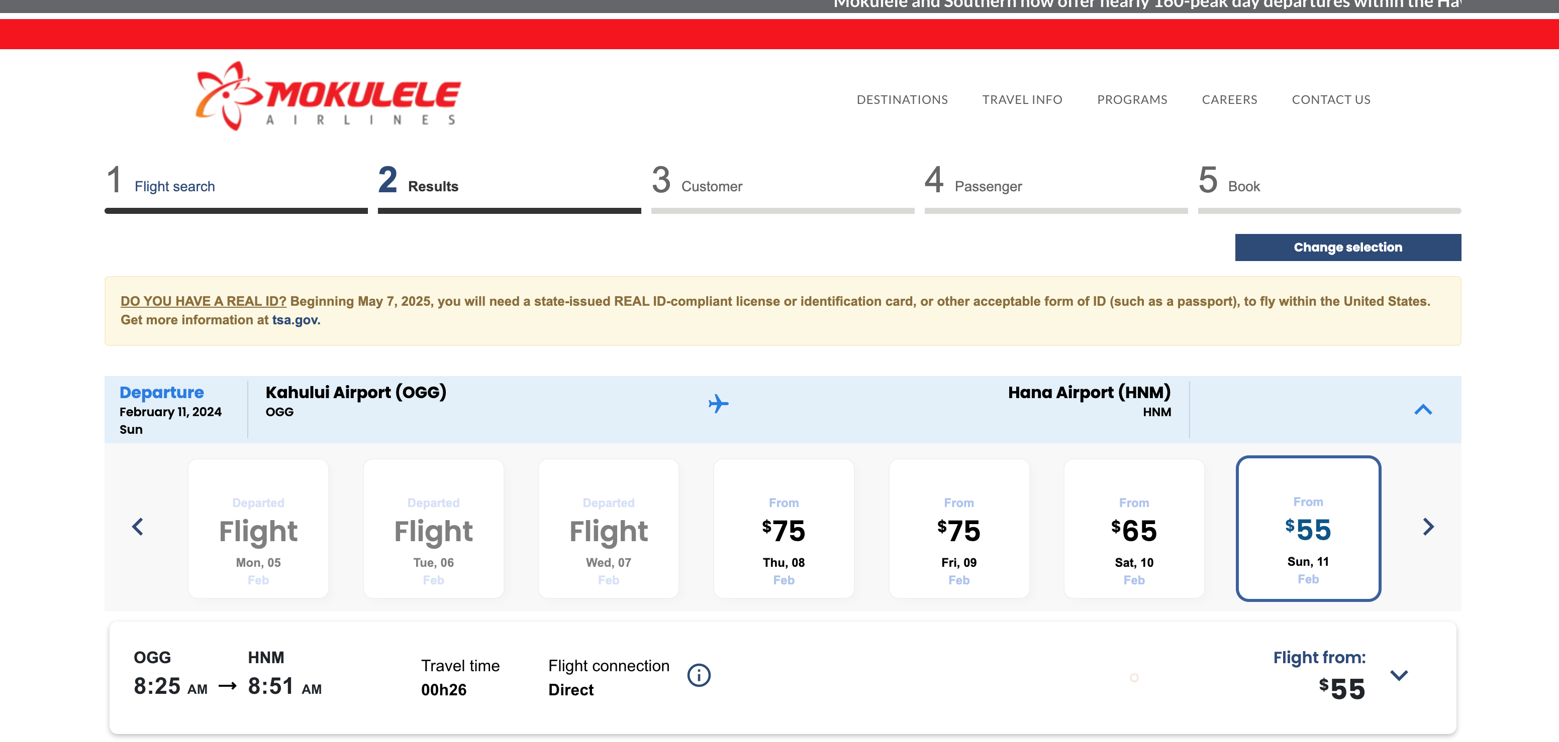 Booking page for Mokulele Airlines for a trip to Hana on Maui. MOKULELE AIRLINES