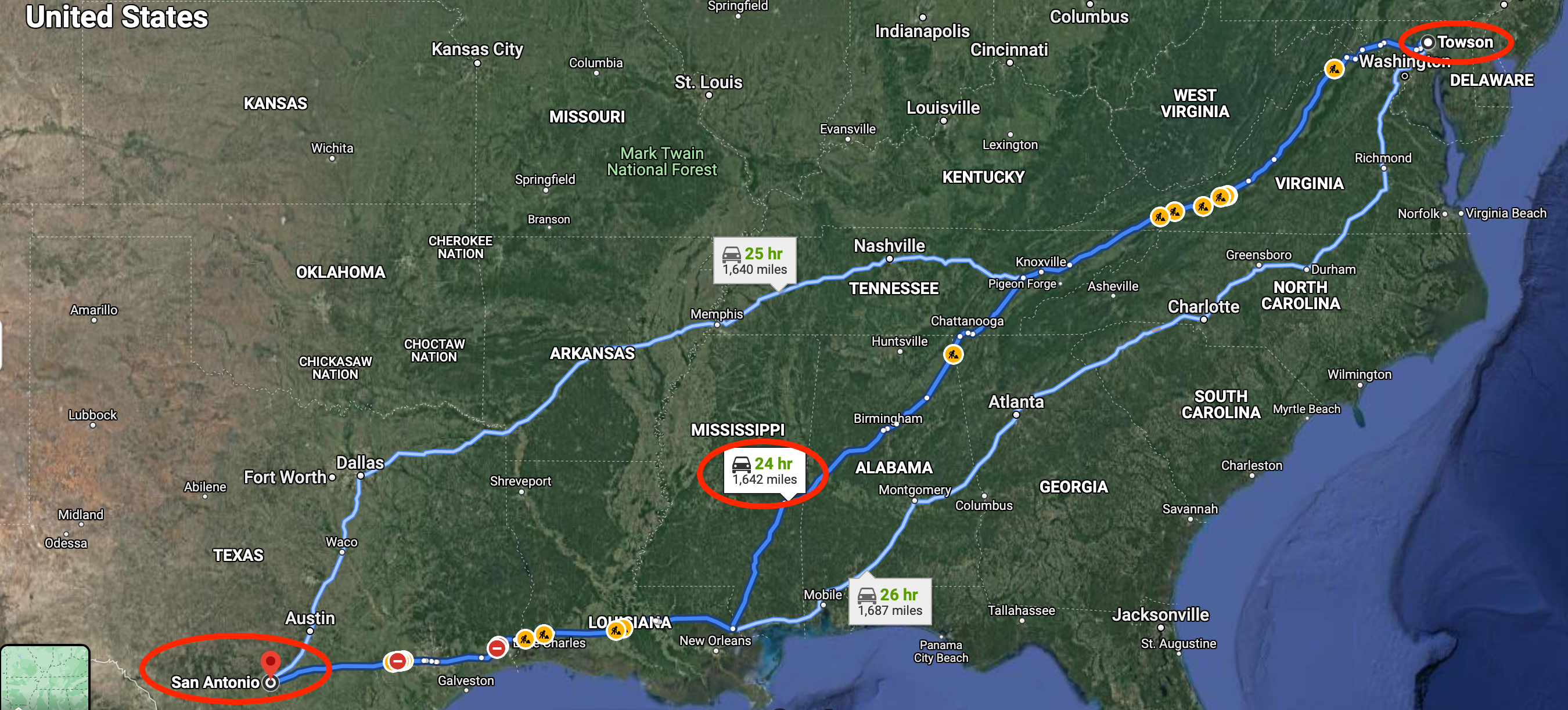 Although speed limits on the trip ranged from 55 in Baltimore up to 70 in Texas, no one paid any mind to them during both of my trips. The interesting thing was there were plenty of highway patrol officers on the road, but I only saw two cars (at once) pulled over during the entire trip.