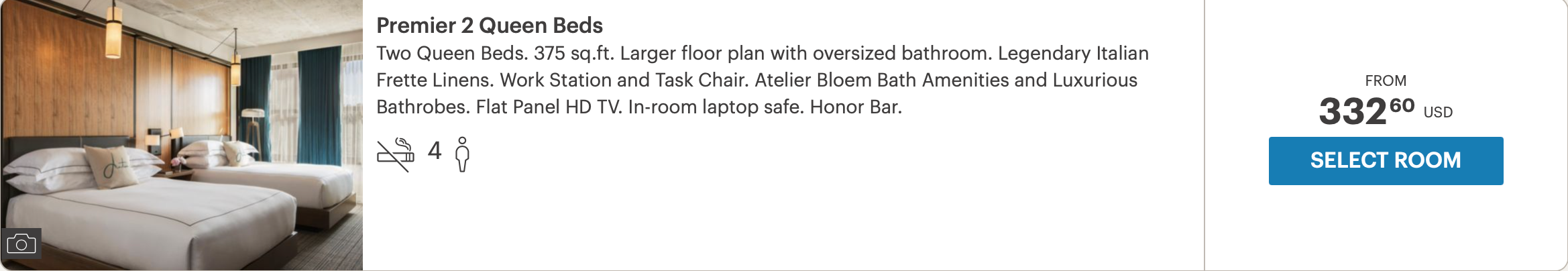 Because I wanted to get my 5x points per dollar spent on my Platinum Card® from American Express, I pre-booked a deluxe room with two queen beds at the Kimpton Aertson in downtown Nashville back in April 2020. The room came to $209.42. That same room now costs $332.60 a night in October.