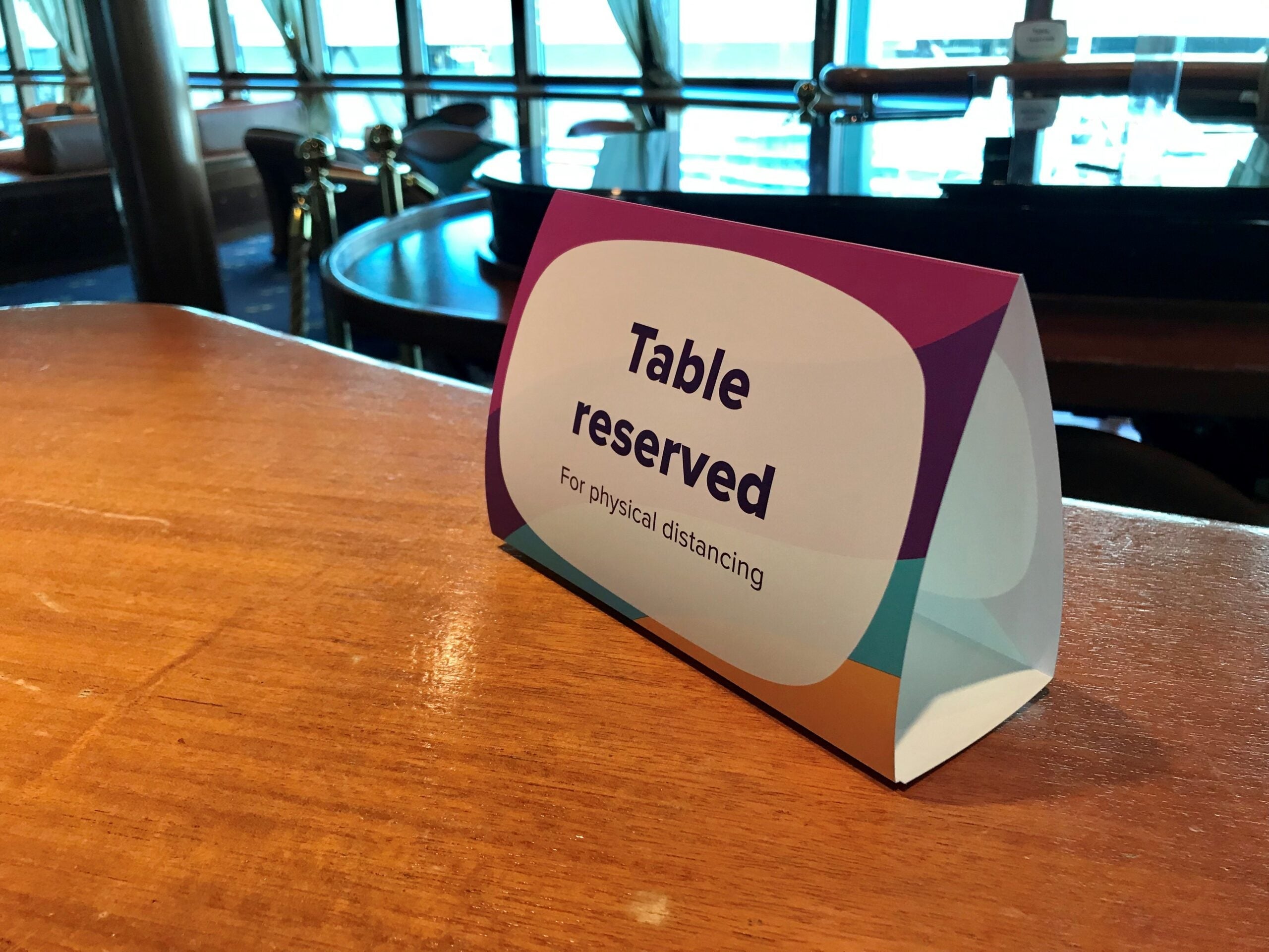 The line also has made changes to venues to encourage social distancing. Many seating areas in lounges, bars and restaurants are blocked off with "table reserved for physical distancing" signs so that they remain unoccupied. Gyms are only open by appointment.
