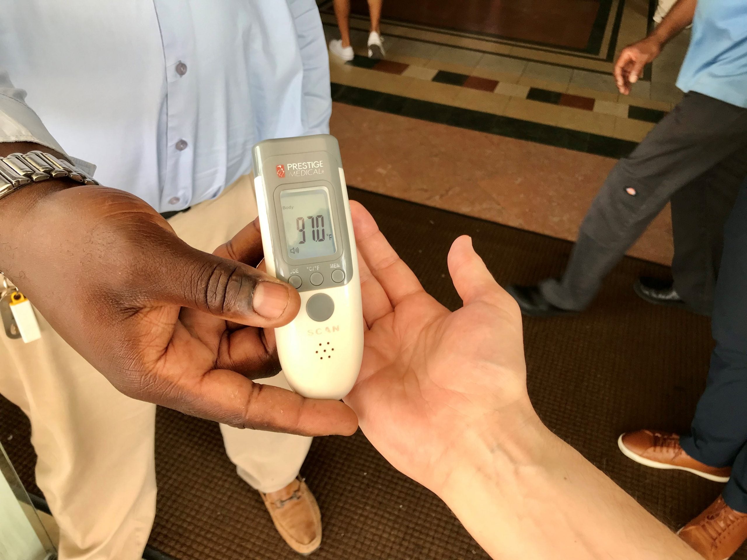 There, we had to undergo a quick temperature screening just to get into the building — done with an electronic temperature reader.