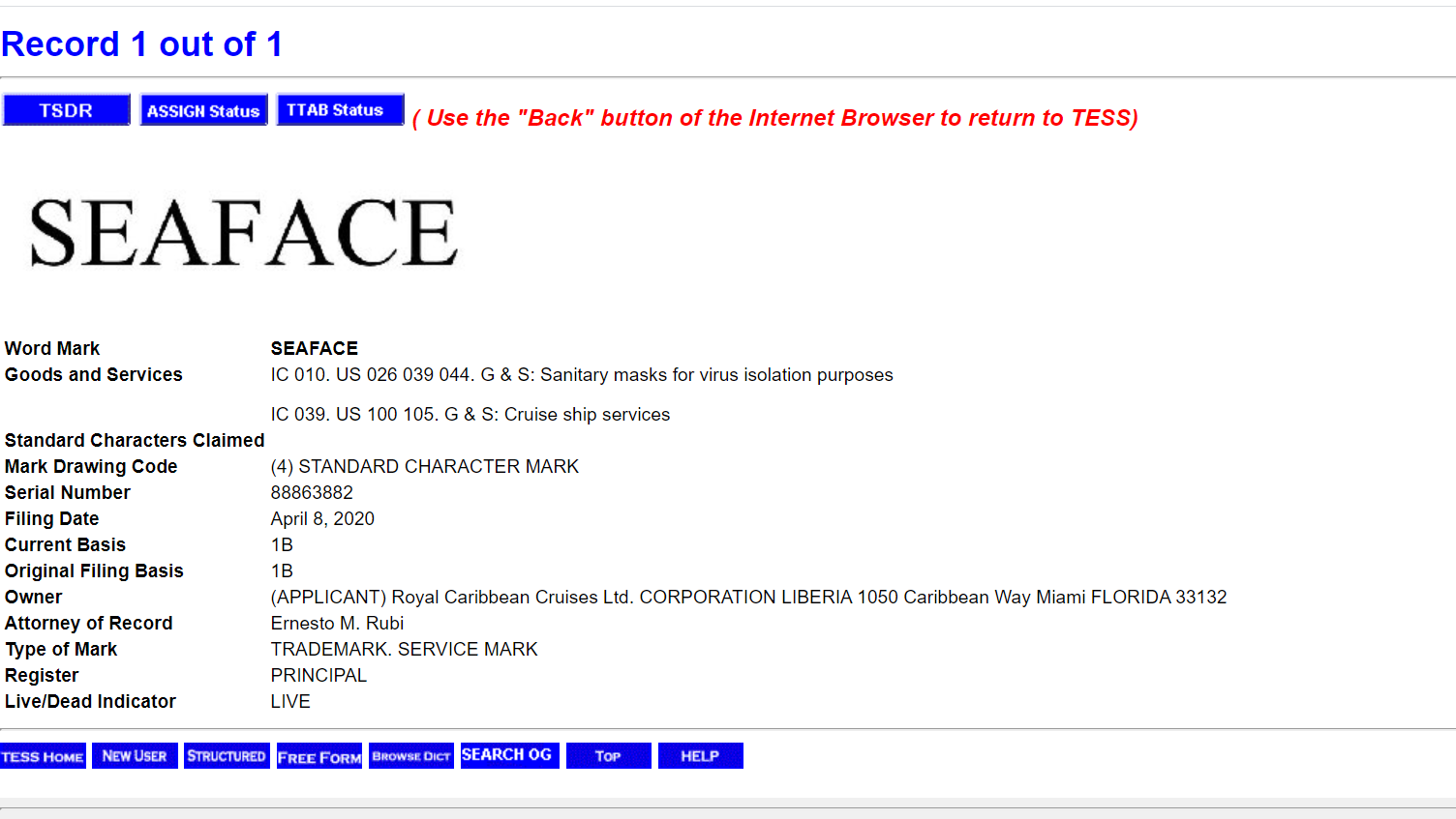 Royal Caribbean isn't saying for sure, but the line's parent company, Royal Caribbean Cruises Ltd., has filed a trademark application with the U.S. Patent and Trademark Office for the word "seaface" to be used in conjunction with a sanitary mask.