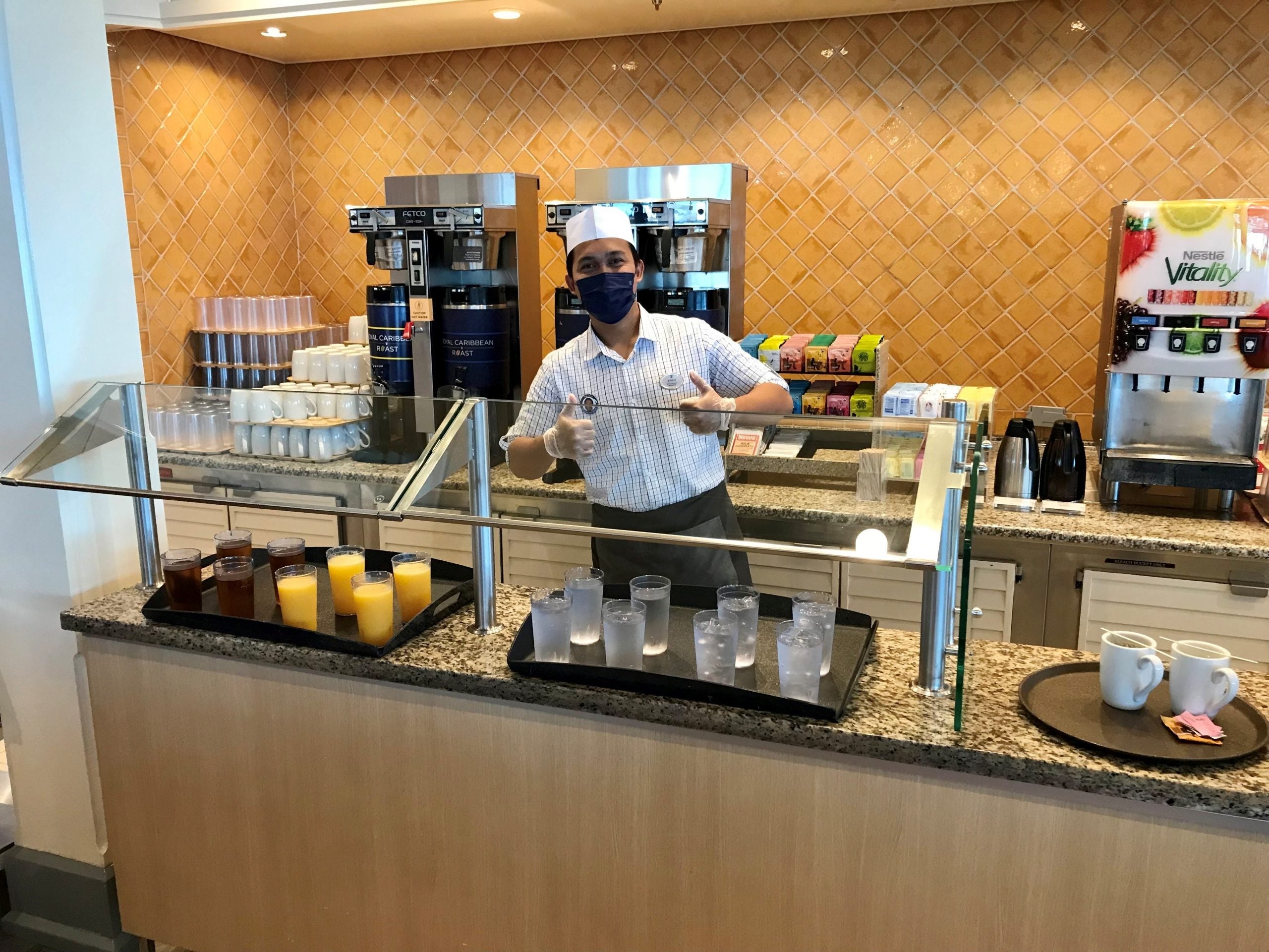 I've noticed crew members vigorously wiping down tables with special sanitizing sprays in the ship's Windjammer buffet after every use, and they hover around waiting for the next table to clean. They also are pushing passengers at every turn to sanitize their hands at ubiquitous sanitizer stations and wash their hands at washing stations at the entrance to eateries.