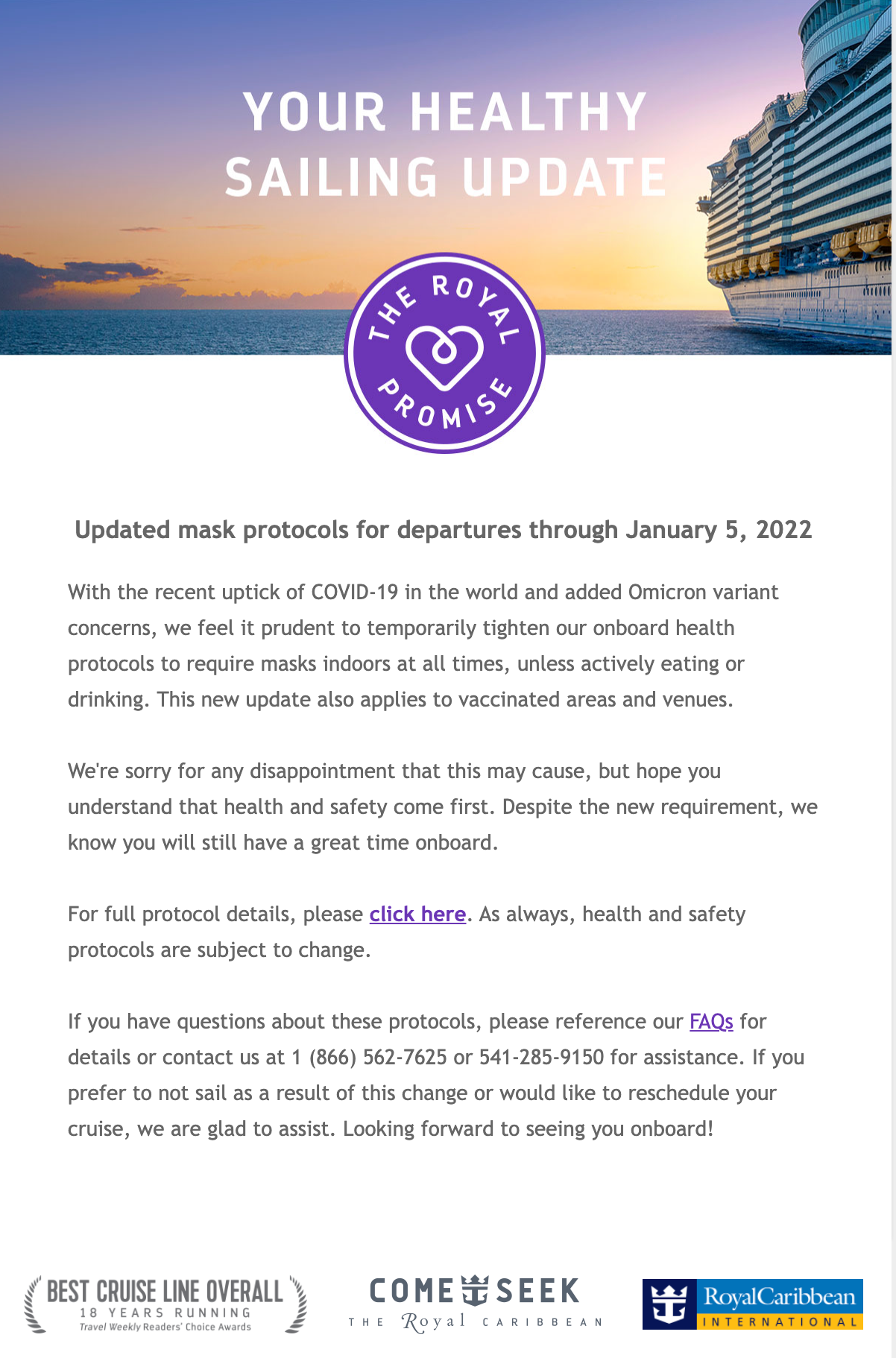 In response to the increase in COVID-19 cases due to the omicron variant, Royal Caribbean has tightened its onboard mask policies. The line will now require all passengers to wear masks in all indoor public areas unless eating or drinking.
