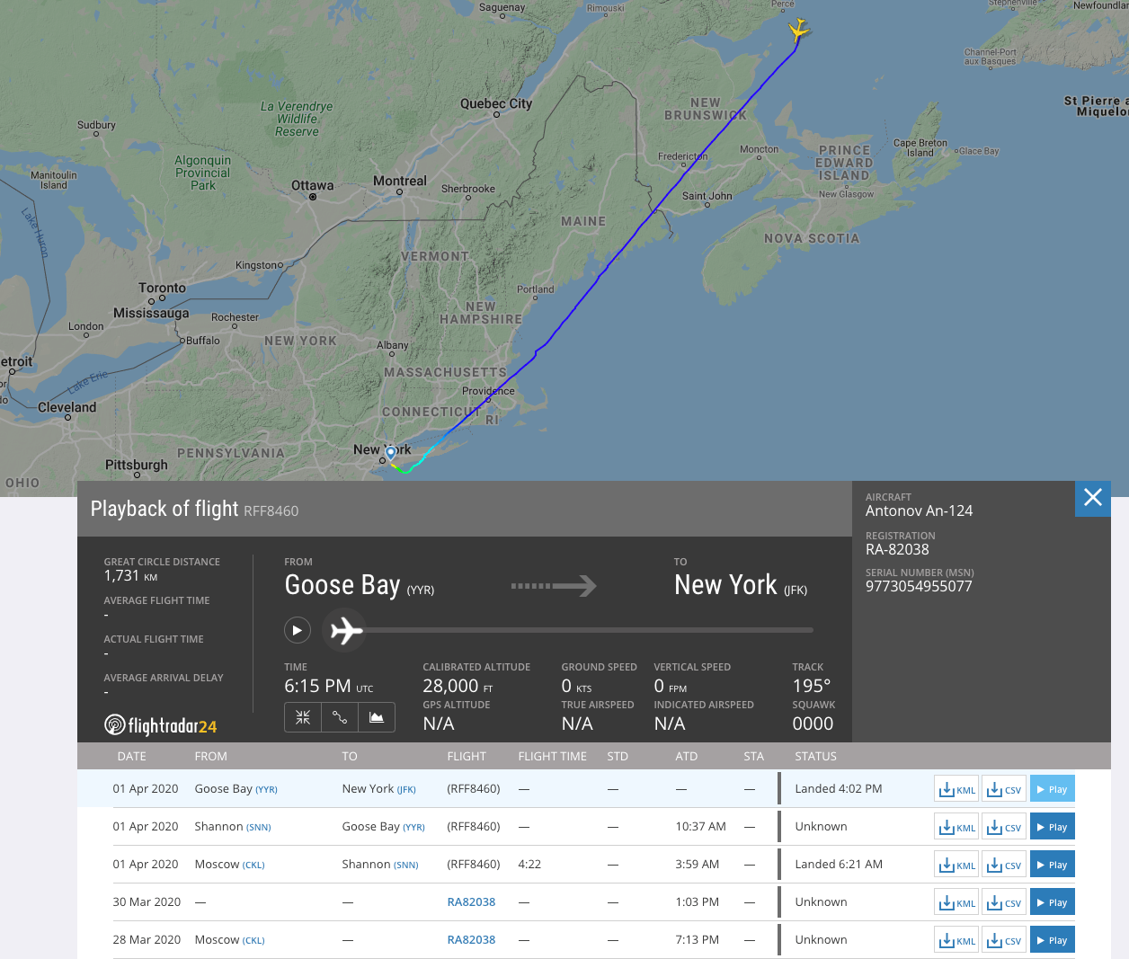 Tracking site Flightradar24 showed that the plane landed at 4:02 p.m and that it left JFK at 10:24 a.m. Thursday, eastbound over the Atlantic. It had come to New York from Chkalovsky, a military airfield near Moscow, via Shannon in Ireland and Goose Bay in Canada, where it had stopped for fuel.