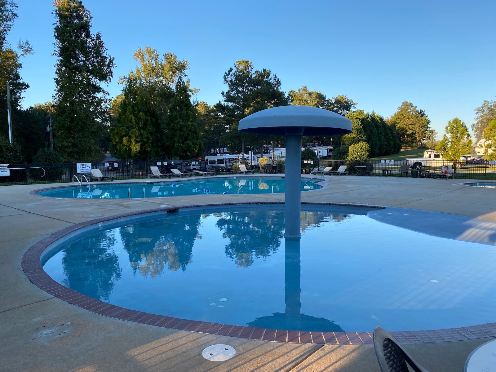 The Pine Mountain RV Resort in West Georgia offers everything a normal RV park with full hookups offers, meaning water, power and sewer connections. On top of that, it also has a swimming pool area with separate kids' pool and separate whirlpool, playground, on-site store (where the coffee bar is located), fitness room, sports courts, dog park, activities pavilion and multiple bathhouses with showers, laundry and restrooms.