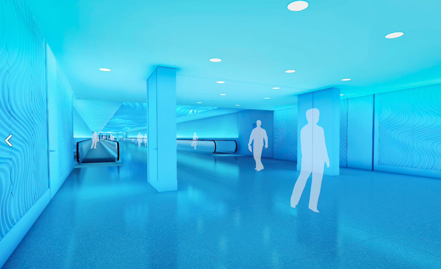 This new tunnel, which cuts the walk by up to a quarter of a mile, isn't just a mere convenience. It's also designed to be visually appealing with artwork by Gordon Huether, the man behind the airport's flagship "The Canyon" piece, lining the ceilings of the tunnel.