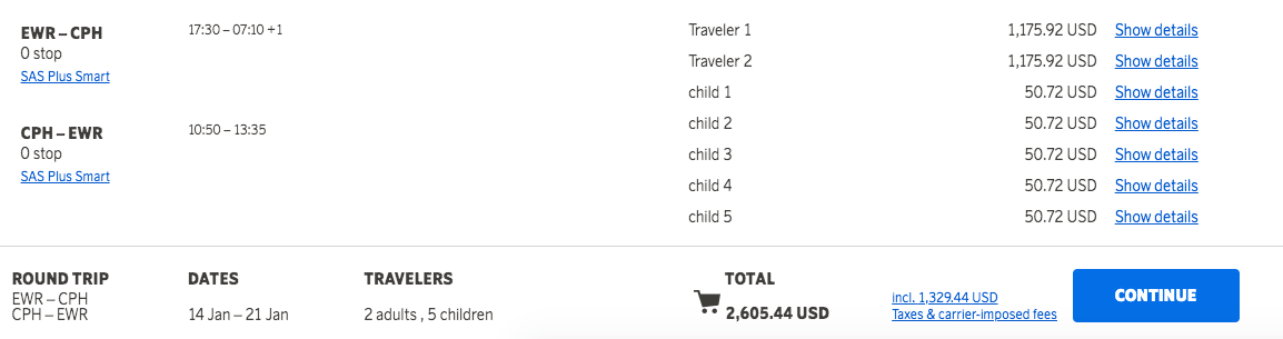 Prices for round-trip economy tickets from the U.S. to eligible destinations start at around $500 - $600 for adults, with children tacking on about $50 to $70 in taxes/fees per ticket. As an example, you can fly one adult and five children from Newark (EWR) to Copenhagen (CPH) for just $864 in economy — that breaks down to $144 per person.