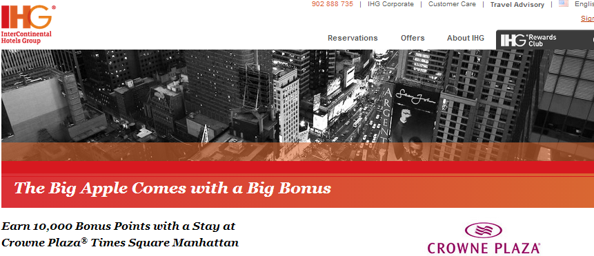 Crowne Plaza Times Square Offers 10,000 IHG Bonus Points: The Crowne Plaza Times Square in New York City is offering 10,000 bonus points for a two-night stay booked by July 31, 2014. While booking, you must select the specific two-night bonus package, as this offer is not valid with just any two-night stay, you must choose the specific 10,000 point bonus stay in order to receive the extra points.