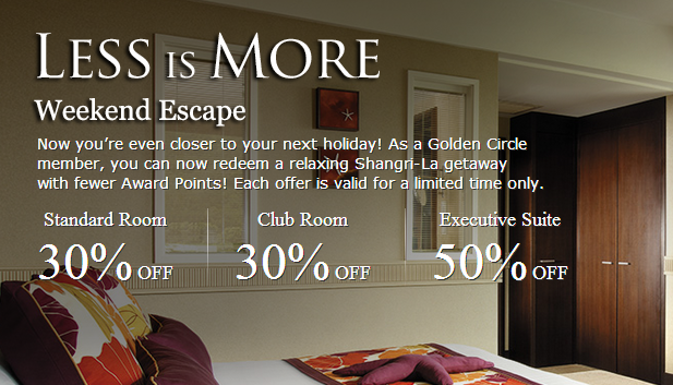 Shangri-La Offers "Less Is More" Promotion: Shangri-La Hotels are running a discount promotion from May 2-July 27, 2014 for weekend award stays that are booked by July 27, 2104. The offer is for members of the Golden Circle, their loyalty program. The discounts are as follows: 30% off standard and club room awards and 50% off executive suite awards. Weekend stays are considered as Fridays, Saturdays and Sundays. The following hotels are excluded from this offer: Shangri-La Hotel, Paris, Traders Hotel, Kuala Lumpur, Shangri-La’s Rasa Ria Resort, Kota Kinabalu, Shangri-La’s Rasa Sayang Resort & Spa, Penang and Shangri-La’s Rasa Sentosa Resort & Spa.