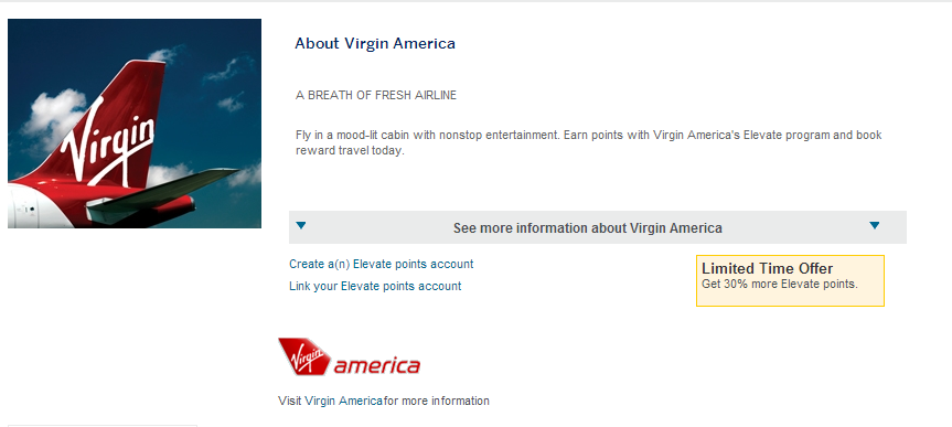 Reminder: Amex Virgin America 30% Transfer Bonus: American Express is offering a 30% bonus on transfers to Virgin America Elevate points until April 30, 2014. Normally points transfer at the ratio of two Amex points to one Elevate point, but with this promo, you can transfer 200 Amex points to get 130 Elevate points instead. This bonus is hard-coded so there is no need to register for it.