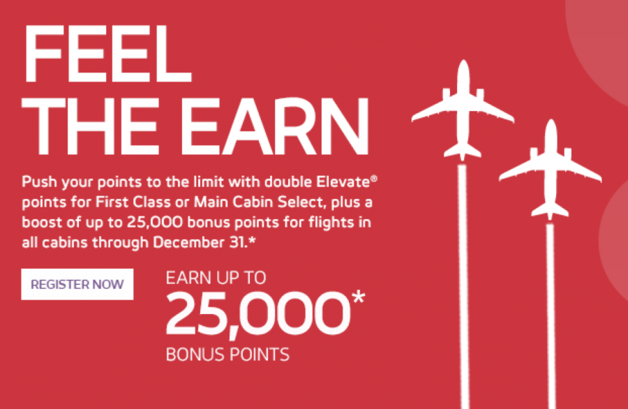 Up to Double Points - Including Elite Qualifying Points from Virgin America: Earlier this week, Virgin America launched a promotion that will allow you to rack up tons of points if you purchase Main Cabin Select or First Class fares and a decent amount of points if you purchase and fly in coach fares from now until December 31, 2013. To participate in this offer, you must register here, and then you will earn 10 points per dollar when you book First Class (J, C, D Fare Classes) or Main Cabin Select (W, Q, Z Fare Classes) fares. Then there's a separate bonus of up to 25,000 additional points that is calculated on the base amount of points you earn from flights September 10- December 31, 2013 which includes Economy, Main Cabin Select and First Class fares. The best part is all bonus points earned during the promotion will count towards elite status.