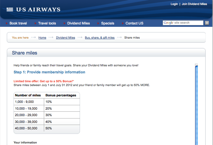 US Airways is also offering a bonus of up to 50% on transferred miles good until July 31, 2012, but since it comes so close behind the recently ended 100% bonus on purchased US Airways miles, it's a bit less impressive even than it would have been otherwise.
