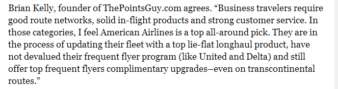 Forbes Picks Best Airlines For Business Travelers: A good business airline gets you where you want to go and gives you a variety of times and options to get there. I was quoted in this article talking about American Airlines and why I think it is one of the best options for business travelers, because they are updating their fleet and have not yet devalued their frequent flyer program. Another pick is Delta for their inflight WiFi availability and frequent schedules across many networks. It often comes down to which airline hub you live close to, as this can easily affect which airline options are best for you.