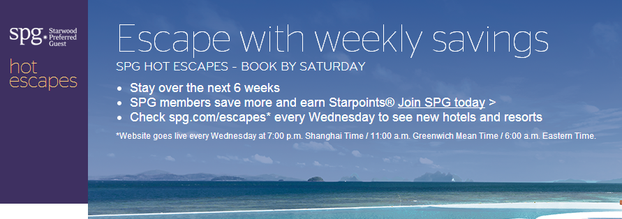 SPG Escapes Offers Weekly Discounts: SPG members who take advantage of these deals can save 25% off the daily rate, while non-members will receive a discount of 20% off. These will be going on each week from Wednesday through Saturday, so make sure to check out the deals for this week and book. Some of the deals this week include (pricing is per night): the Westin Chicago River North for $99, the Le Royal Meridien Abu Dhabi for $87, the Westin Bonaventure Hotel & Suites Los Angeles for $127, and many more.