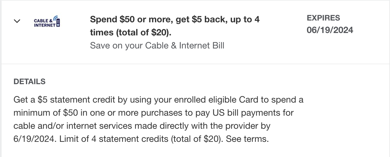 I utilized three Amex Offers that helped me save on two recent bills. I activated an offer to get $5 back after spending $50 or more on cable or internet bill payments made directly with the provider using my Amex card.