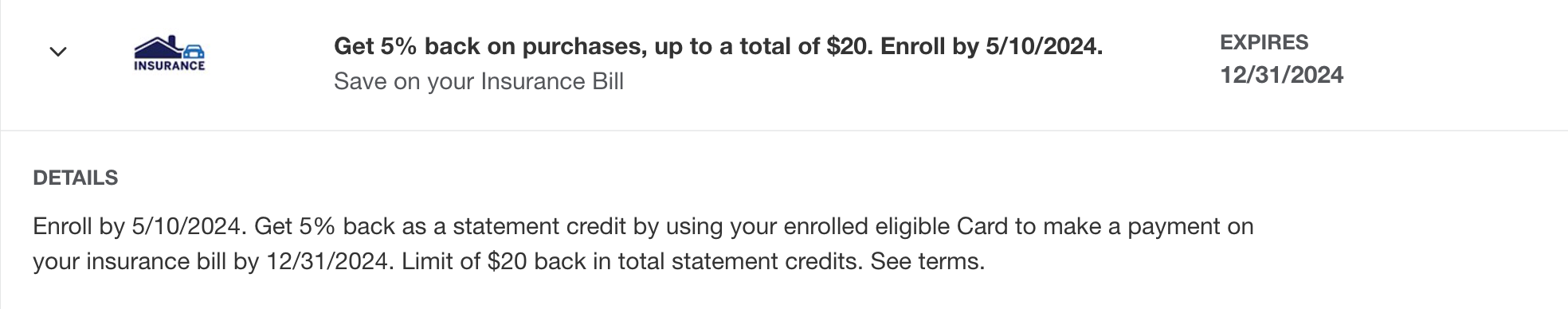 I also used two Amex Offers to make my first renters insurance payment. I was targeted for two separate offers to get 10% and 5% back on insurance bills.