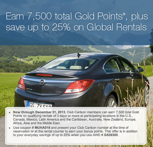 7,500 Club Carlson Points and 25% off of Avis Rentals: Now through December 31, 2013, Avis is offering a total bonus of 7,500 Club Carlson Gold points and a 25% discount to members on qualifying car rentals of 3 or more days at participating locations in the US, Canada, Europe and around the world. Make your reservation here, use the coupon MUHA018 and present your Club Carlson number at the time of reservation or at the rental counter to earn your bonus points. This offer is in addition to your everyday savings of up to 25% when you use AWDG639300.