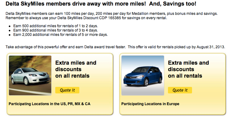 Earn Bonus Delta SkyMiles with Hertz: Delta and Hertz have teamed up to offer SkyMiles members an opportunity to earn bonus miles when renting with Hertz this summer. Here’s how it works: You can earn 500 bonus miles for rentals of 1 to 2 days; 900 bonus miles for rentals of 3 to 4 days; or 2,000 bonus miles for rentals of 5 or more days. This is in addition to the standard 100 miles normally earned per day, or 200 miles if you’re a Medallion member. To earn the bonus miles, use the code CDP 165385. Delta customers can also save up to 40% off Hertz rentals in the US, Puerto Rico, Mexico and Canada by using PC 123841 when making their reservation. You can also earn up to 15% off rentals in Europe with PC 170424, and at other worldwide locations with PC 123841. This offer is valid for reservations made by June 30, 2013 and picked up by August 31, 2013.